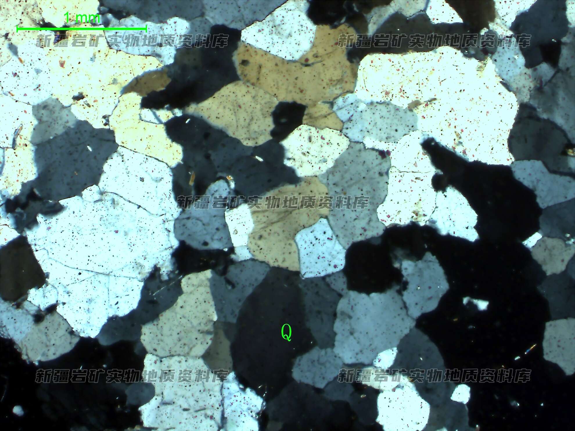 岩石特征描述: 石英(Q)呈他形粒状,边缘呈较平直直线、不规则状紧密镶嵌,多具波状消光。
