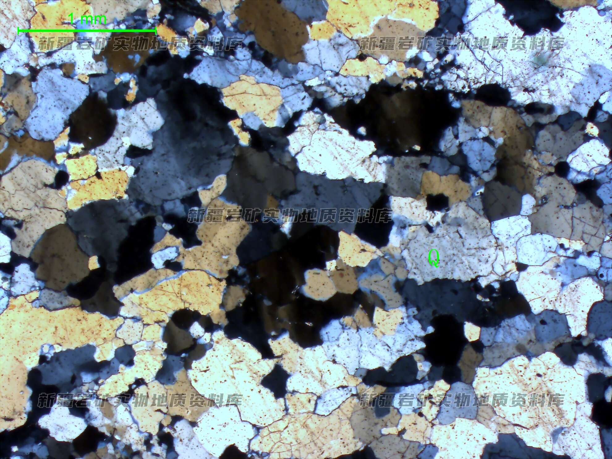 岩石特征描述: 石英(Q)呈他形粒状,边缘呈不规则状紧密镶嵌,表面干净,多具波状消光。