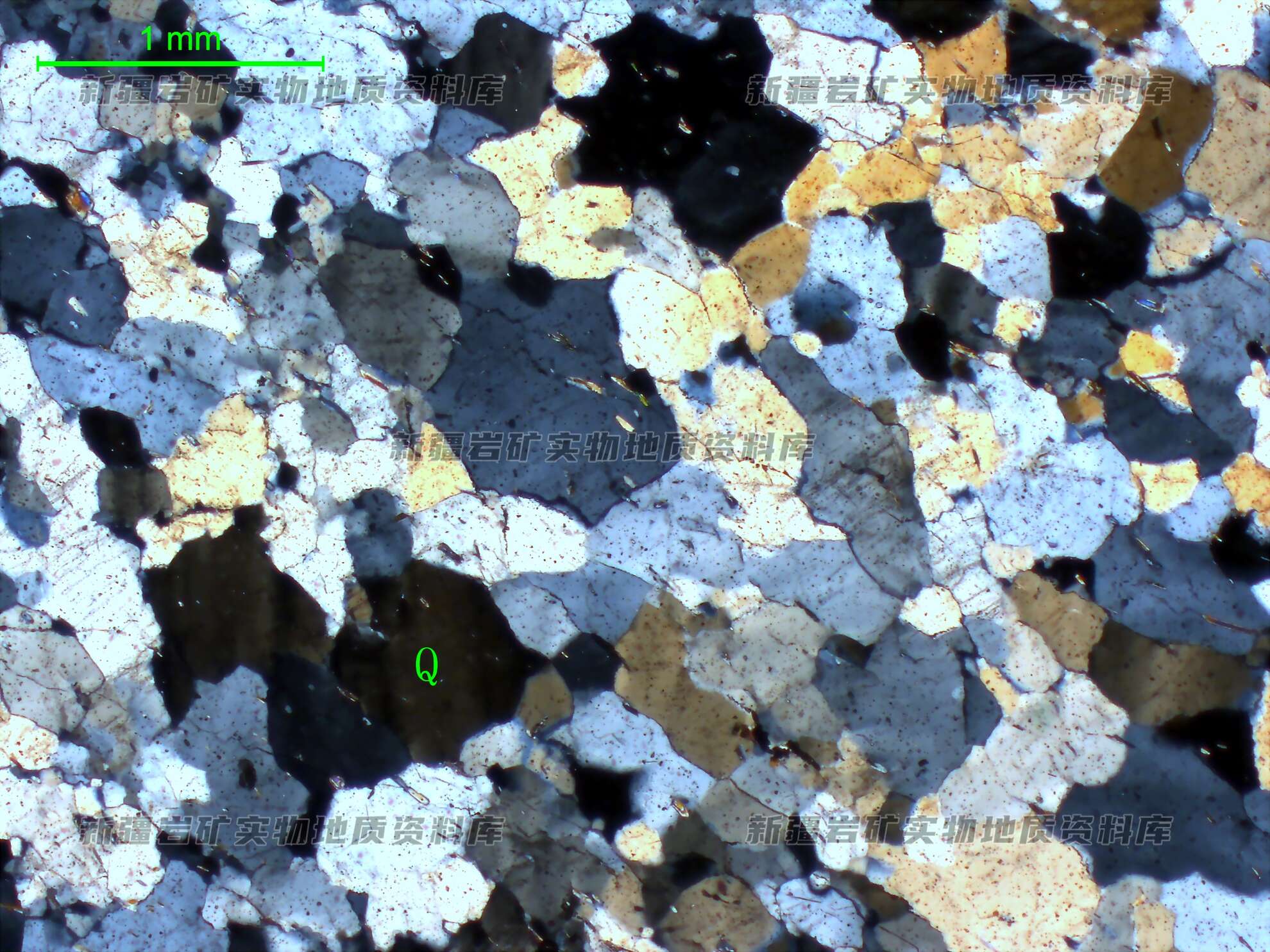 岩石特征描述: 石英(Q)呈他形粒状,边缘呈不规则状紧密镶嵌,表面干净,多具波状消光,受应力作用,石英晶粒有些压扁拉长,微显定向排列。