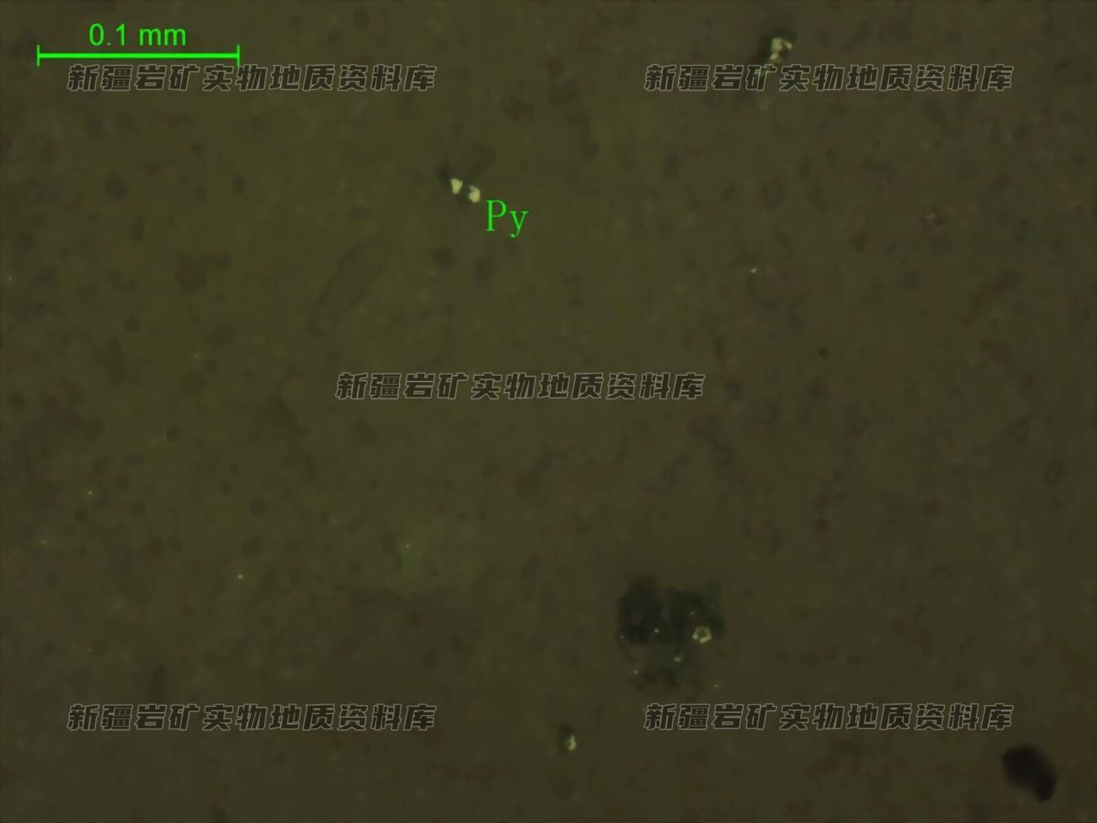 岩石特征描述: 光片中可见微量金属矿物,为黄铁矿(Py),部分褐铁矿化。光片中金属矿物微量,结晶量也微细,大部分0.01-0.02mm,个别在0.05mm 。较均匀分布透明矿物之间。并具不同程度的褐铁矿化。