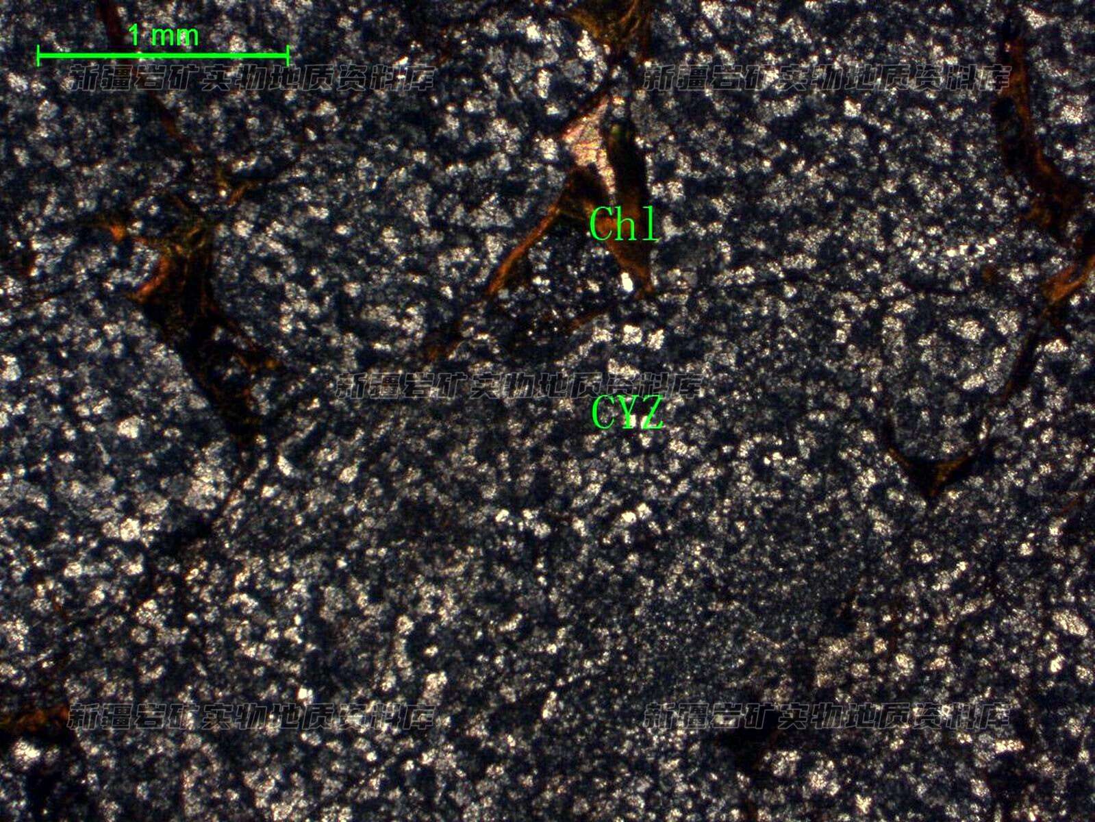 岩石特征描述: 岩石主要由长英质(CYZ)基质组成,呈包含霏细斑点状分布,其中分布少量绿泥石(Chl)。 岩石由火山碎屑、胶结物组成,火山碎屑主要由角砾及碎屑组成,分布少量凝灰碎屑。碎屑由岩屑组成,岩屑主要由酸性熔岩组成,其次分布有少部分安山岩,个别斑状花岗岩碎屑。碎屑没有明显搬运现象,具火山碎屑特征。呈棱角状外形胶结物以蚀变,由微晶状长英质组成,不均匀叠加有碳酸岩胶带现象。