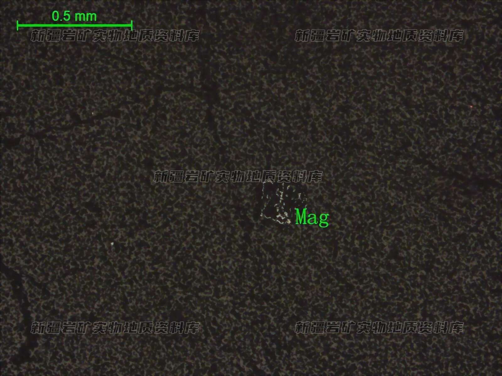 光片中只见到个别自形粒状磁铁矿(Mag),磁铁矿具褐铁矿化。 光片中只见到个别自形粒状磁铁矿,磁铁矿具褐铁矿化,偏细的磁铁矿已完全褐铁矿化。