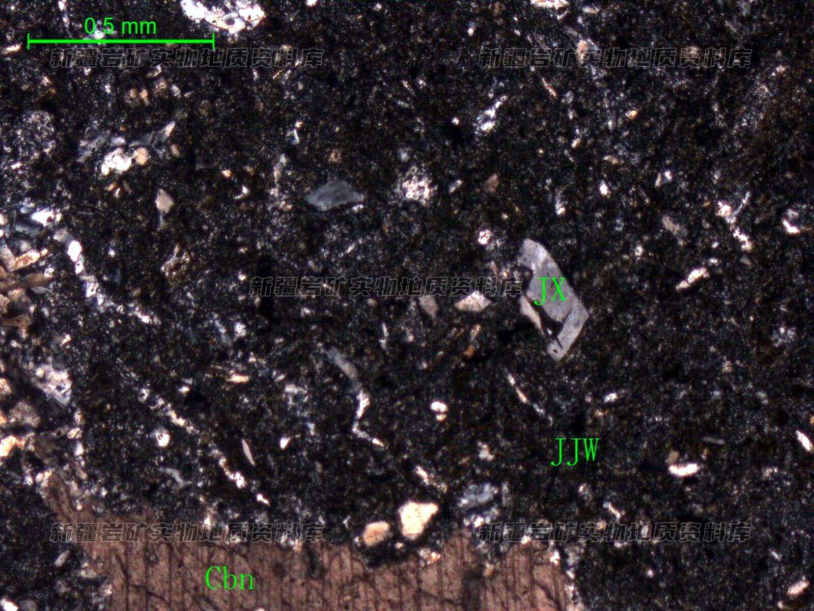 岩石特征描述: 岩石中的凝灰碎屑由玻屑、少部分晶屑(JX)及少量岩屑组成,胶结物(JJW)由火山灰组成,已蚀变为隐晶状长英质。局部见碳酸盐(Cbn)、钠长石细脉。岩石由凝灰碎屑及胶结物组成。凝灰碎屑由玻屑组成。分布少部分晶屑,少量岩屑。玻屑呈长条状、弧面棱角状,外形可分辨,以脱玻蚀变,以蚀变成长石石英,并具泥化。晶屑由钾长石组成,也具强泥化,另外分布少部分岩屑。岩屑为酸性熔岩(珍珠岩)。胶结物由火山灰组成,以由隐晶状长英质组成。在长英质中分布有少部分细鳞片状绿泥石。岩石中分布有个别细脉,细脉由碳酸岩及钠长石组成。