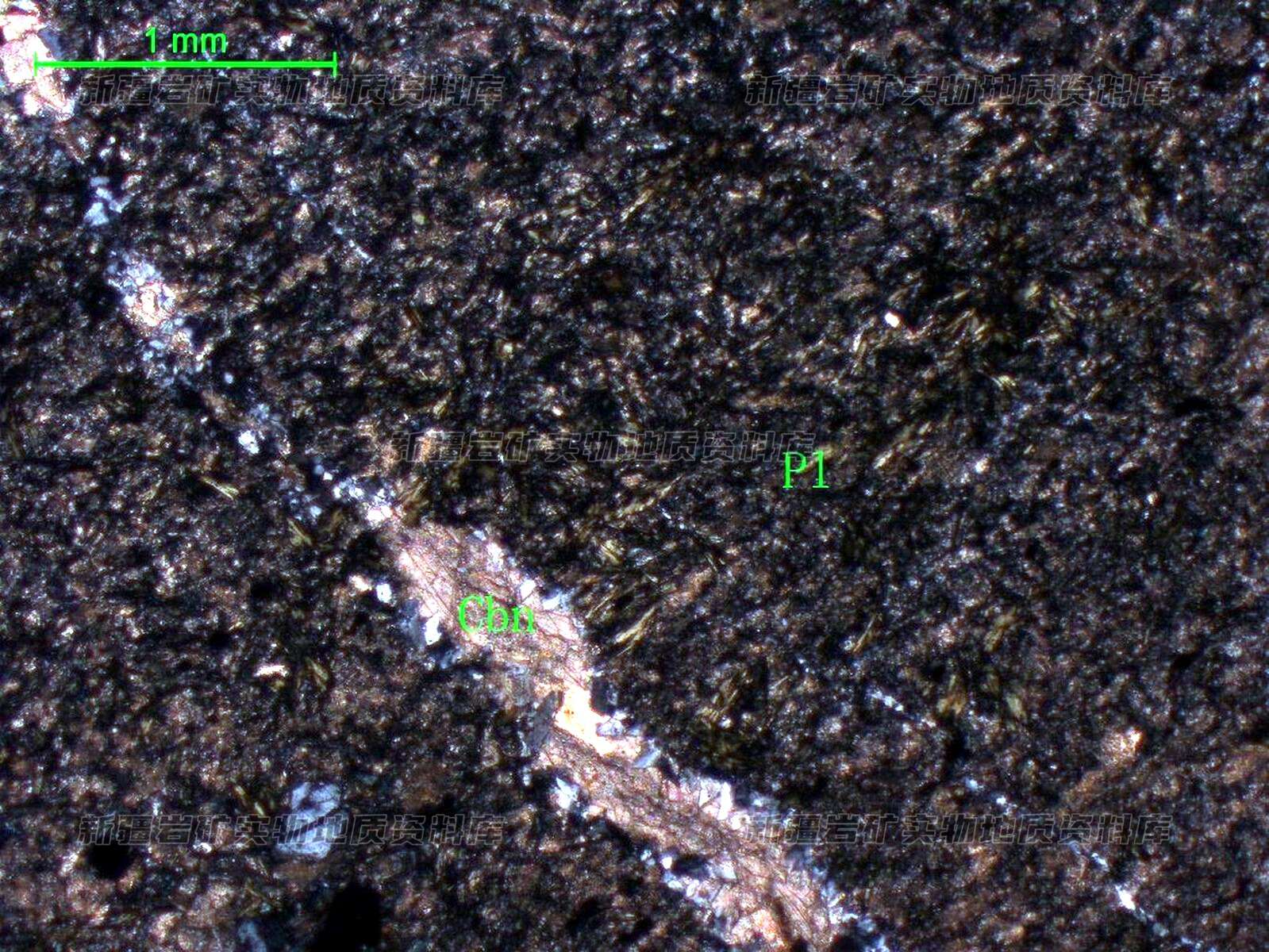 岩石特征描述: 岩石中斑晶含量低,基质中斜长石(Pl)外形模糊,依稀可辩板条状外形,多平行定向分布,呈交织状。岩石具较强碳酸盐(Cbn)化。岩石的斑状结构含有残留,由斜长石及蚀变暗色矿物组成,斜长石以呈眼球状定向分布。具较强碳酸岩化,暗色矿物以被绿泥石替代,已变形拉长,定向分布。基质斜长石外形已很模糊,但板条状外形还可分辨,平行定向分布。具较强碳酸岩化。在斜长石之间分布的暗色矿物,以被绿泥石替代。金属矿物呈微粒状,也定向分布斜长石及绿泥石之间,分布较均匀。岩石受到过一定动力挤压作用。岩石中分布有个别细脉,细脉有石英,褐铁矿及碳酸岩组成。