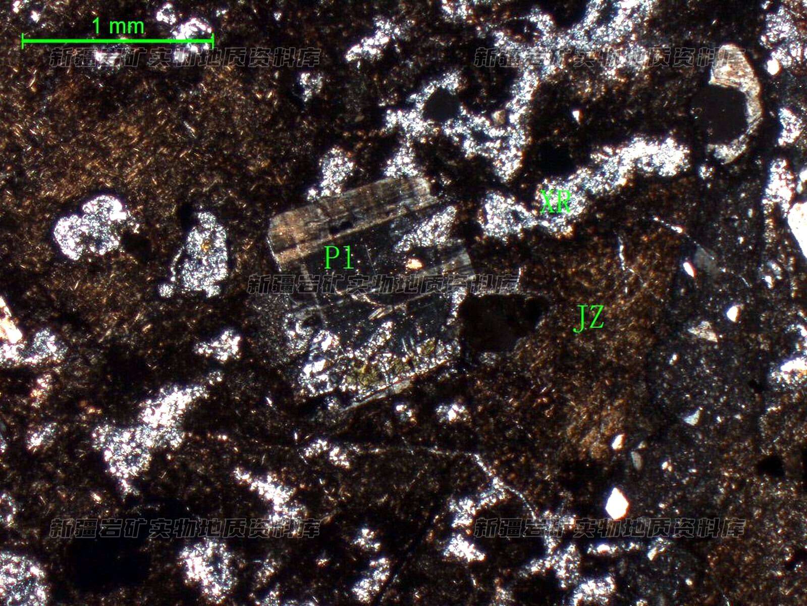 岩石特征描述: 岩石中斑晶主要为斜长石(Pl),呈自形板状,具中度泥化;基质(JZ)主要由玻璃质、微板状斜长石组成,其中分布不规则状杏仁体(XR),其内被石英等矿物充填。岩石具斑状结构,斑晶主要由斜长石组成,斜长石呈自形板状,具中度泥化,为基性斜长石,暗色矿物斑晶已完全暗化,从外形看应为橄榄石蚀变物。基质由玻璃质、微板状斜长石为主组成,分布少部分绿帘石,少量褐铁矿,玻璃质呈浅红褐色,无光性,在玻璃质中杂乱堪布微板状斜长石。不均匀在斜长石及玻璃质之间,分布有少量褐铁矿。基质中分布有5%杏仁体,杏仁体不规则,由石英为主,少部分粘土矿物组成。
