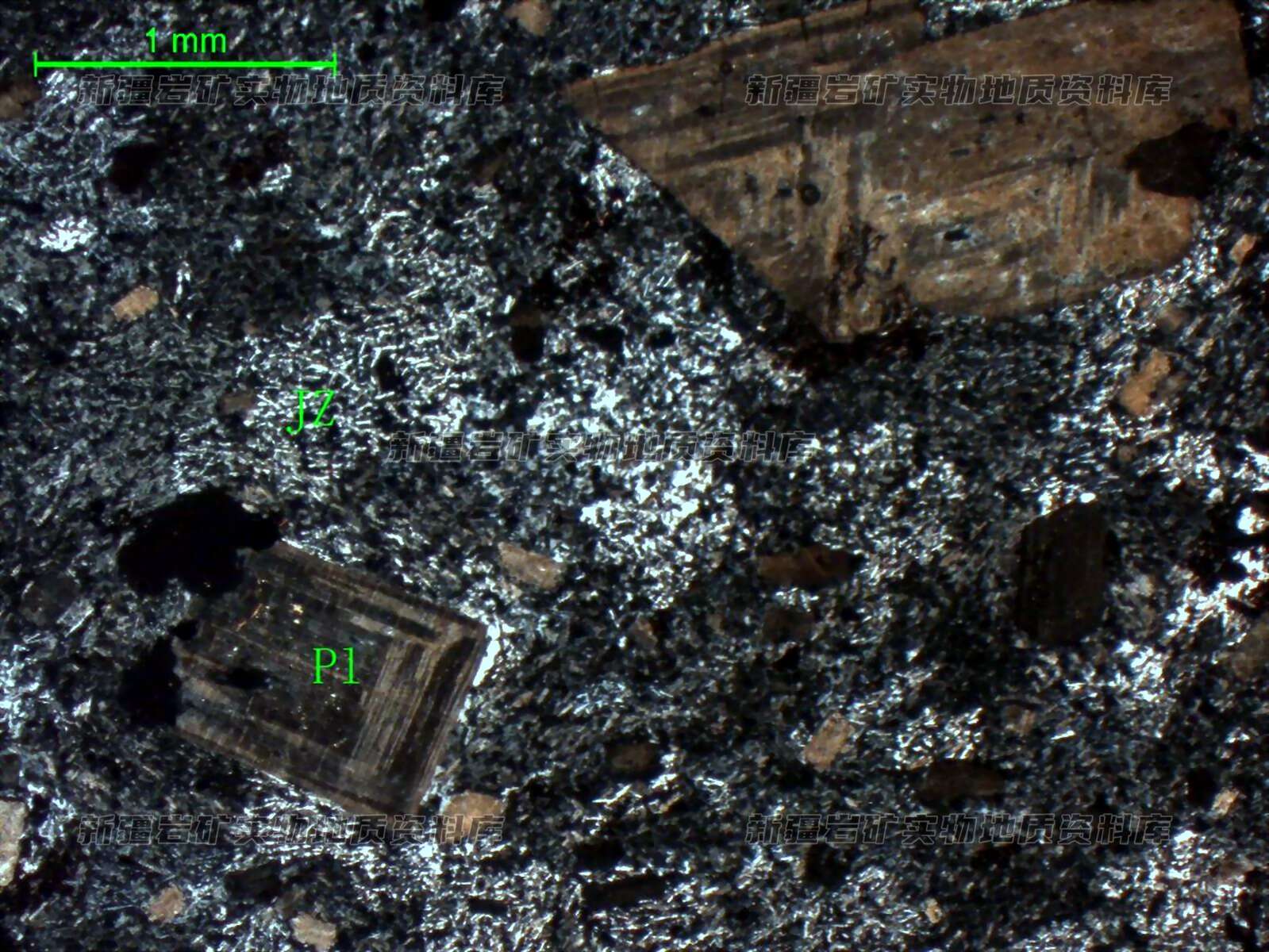 岩石特征描述: 岩石中斑晶为斜长石(Pl),呈板状、宽板状,具强泥化;基质(JZ)主要为微板状斜长石组成,并具泥化,大致定向分布呈交织结构。岩石具斑状结构,斑晶由斜长石组成,分布少量辉石,辉石具暗化,外形较模糊。斜长石呈板状、宽板状,具强泥化,为中长石。个别的暗色矿已完全暗化。基质主要为微板状斜长石组成,并具泥化,大致定向分布呈交结结构。在微板状斜长石之间,分布微粒状辉石,即磁铁矿,辉石也具暗化,磁铁矿由褐铁矿化,玻璃质无固定外形,已有粘土矿物组成。