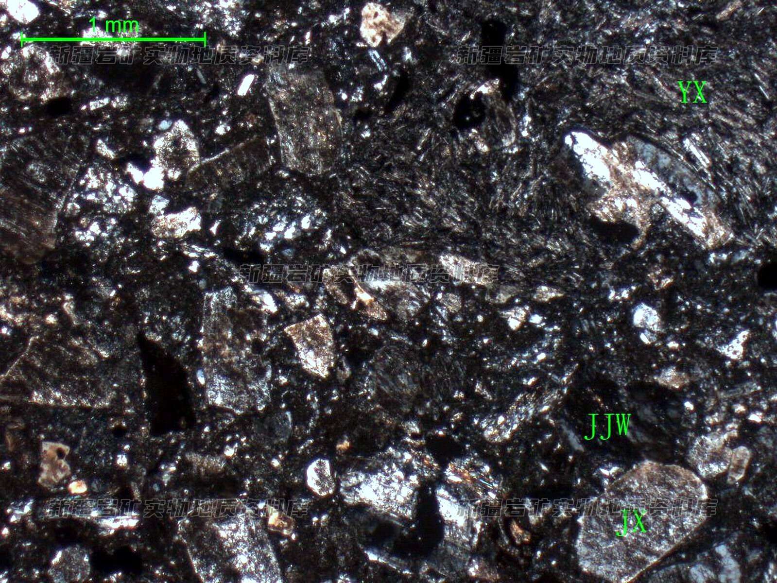 岩石特征描述: 岩石由火山碎屑及胶结物组成,碎屑主要为岩屑(YX)、晶屑(JX)等,胶结物(JJW)由火山灰尘组成,已蚀变为隐晶状长英质矿物。岩石由火山碎屑及胶结物组成,碎屑主要由岩屑组成,分布少部分晶屑,晶屑主要为斜长石,具强泥化,微帘石化。岩屑由酸性熔岩为主,少部分安山岩及玄武岩组成。分布少量金属矿物碎屑。岩屑中以凝灰碎屑为主,角砾碎屑约10%。胶结物由火山灰尘组成,由隐晶状长英质为主组成,分布有少量微晶状帘石,长英质具强泥化。