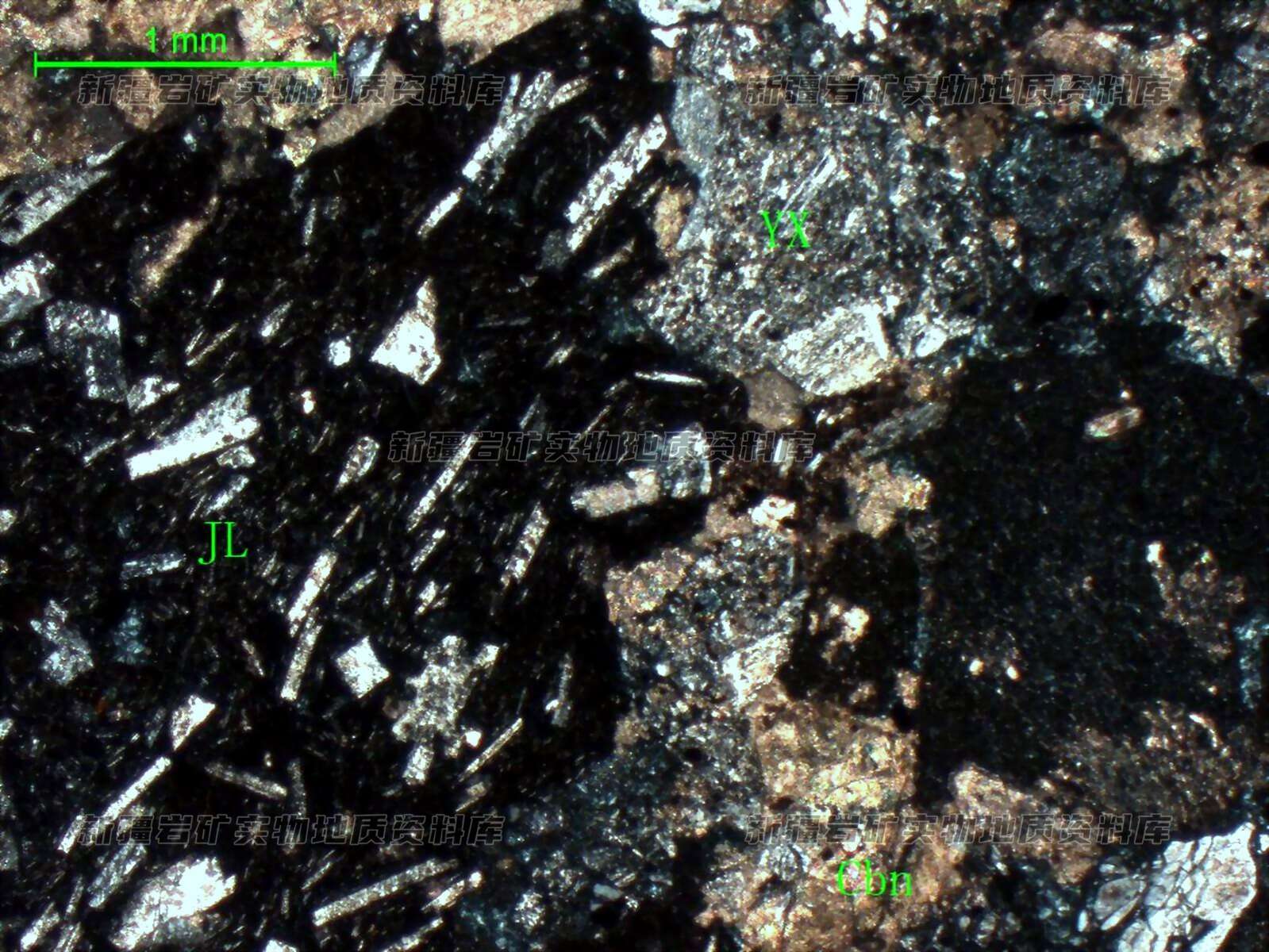 岩石特征描述: 岩石由火山碎屑及胶结物组成,碎屑主要由岩屑(YX)组成,分布少部分角砾(JL),胶结物已蚀变,由绿泥石组成,不均匀叠加碳酸盐化(Cbn)。岩石由火山碎屑及胶结物组成,碎屑主要由岩屑组成,分布少部分晶屑。晶屑由斜长石组成,具泥化,轻度碳酸岩化。岩屑主要由安山岩及玄武岩组成,分布少部分酸性熔岩。少部分岩屑具较强碳酸岩化。碎屑中主要由凝灰碎屑组成,分布有5%角砾级碎屑。胶结物已蚀变,由绿泥石组成,不均匀局总叠加碳酸岩化。