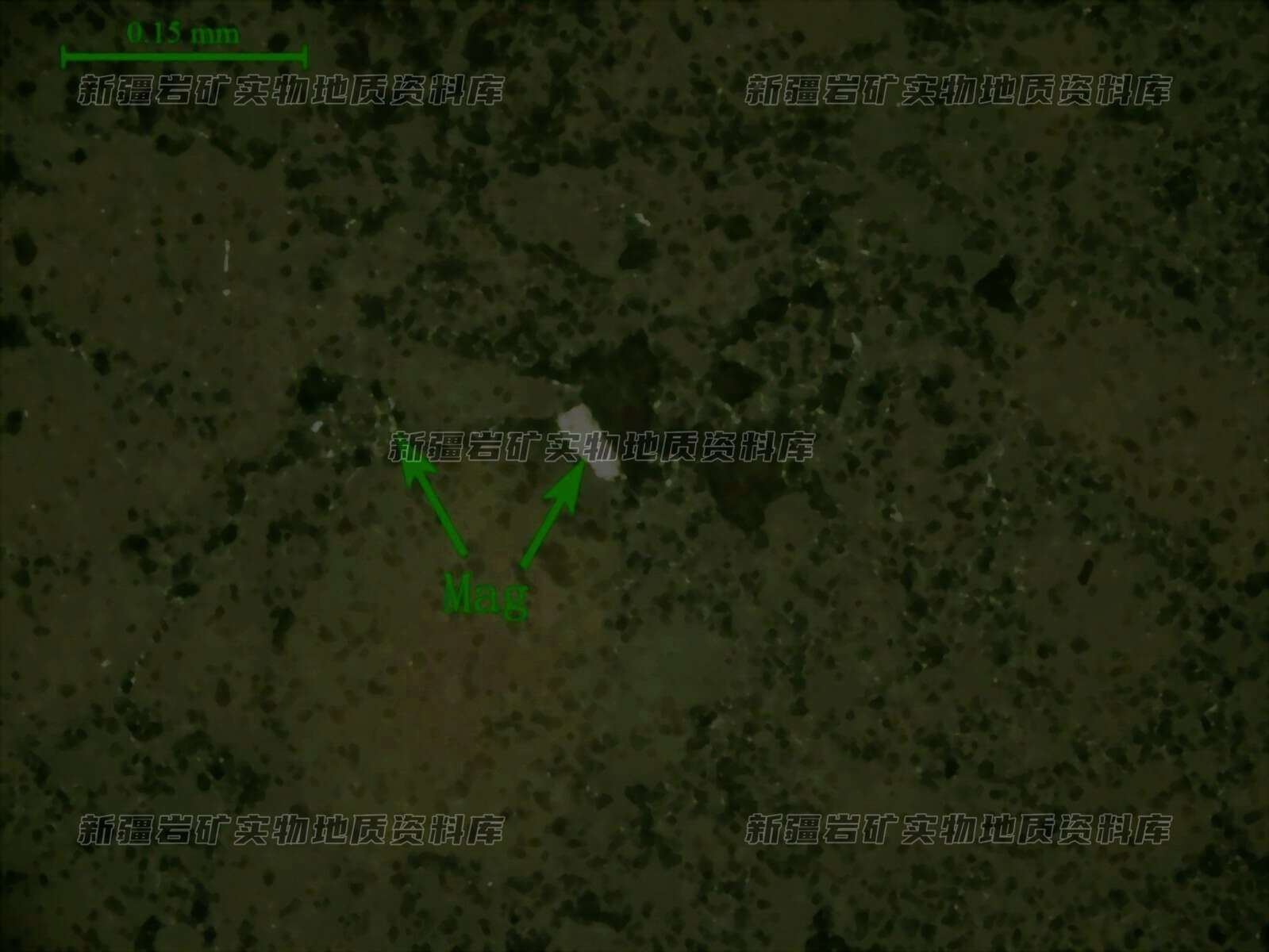岩石特征描述: 岩石中见有两种粒径的磁铁矿(Mag)。 岩石中见有两种粒径的磁铁矿,较大者0.01-0.56mm,呈不规则他形粒状、条状分布于大颗粒矿物边缘或间隙中,另一种粒径小于0.01mm,含量较多,呈不规则细小粒状,集合体状分布于透明矿物内部或边缘,亦可见部分呈细小集合体状沿岩石细小裂隙分布。含量3%。
