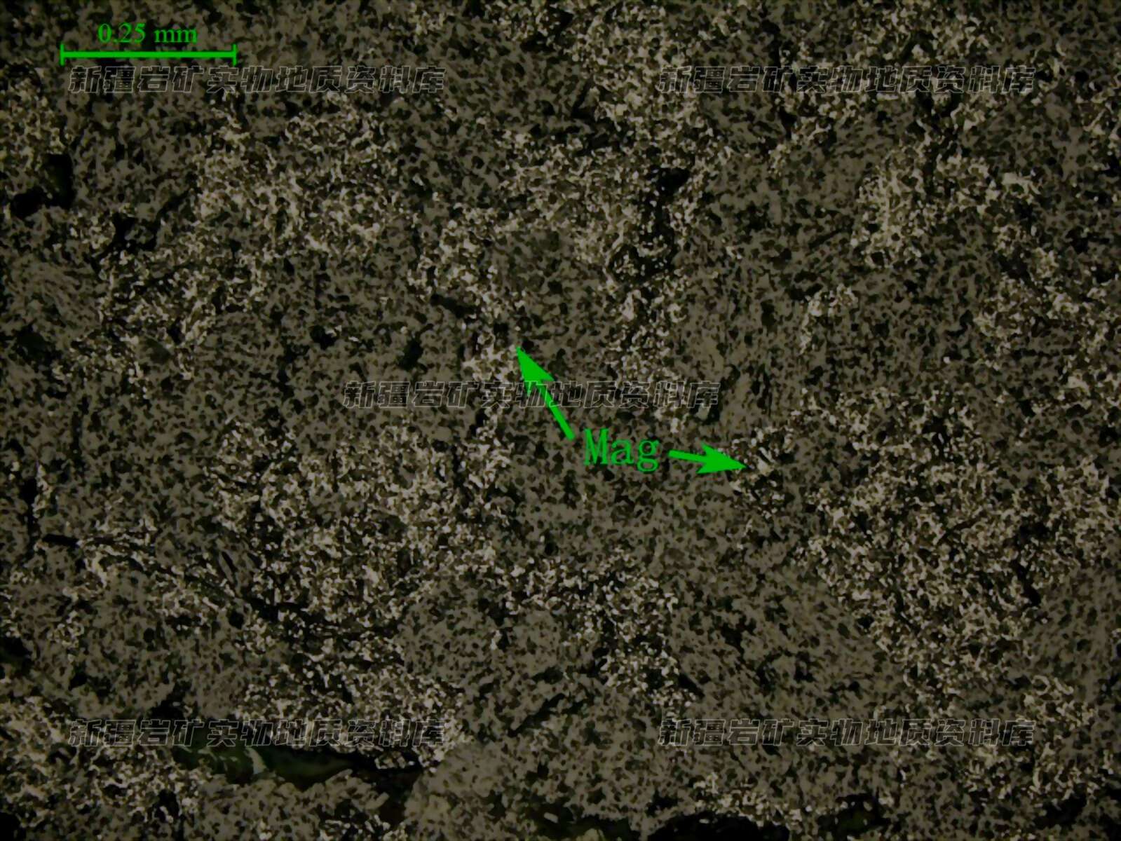 岩石特征描述: 岩石中见大量磁铁矿(Mag)呈稠密浸染状分布。岩石中见大量磁铁矿呈稠密浸染状分布,内部分布少量叶片状赤铁矿,偶见几粒黄铁矿。磁铁矿呈半自形-他形粒状,粒径0.02-0.5mm,多呈团粒状集合体,形态不规则,稠密浸染状分布于透明矿物粒间;赤铁矿呈细小叶片状零星分布,含量很少;偶见黄铁矿他形微粒状,在局部可见单晶粒呈星点状聚集分布透明矿物粒间。