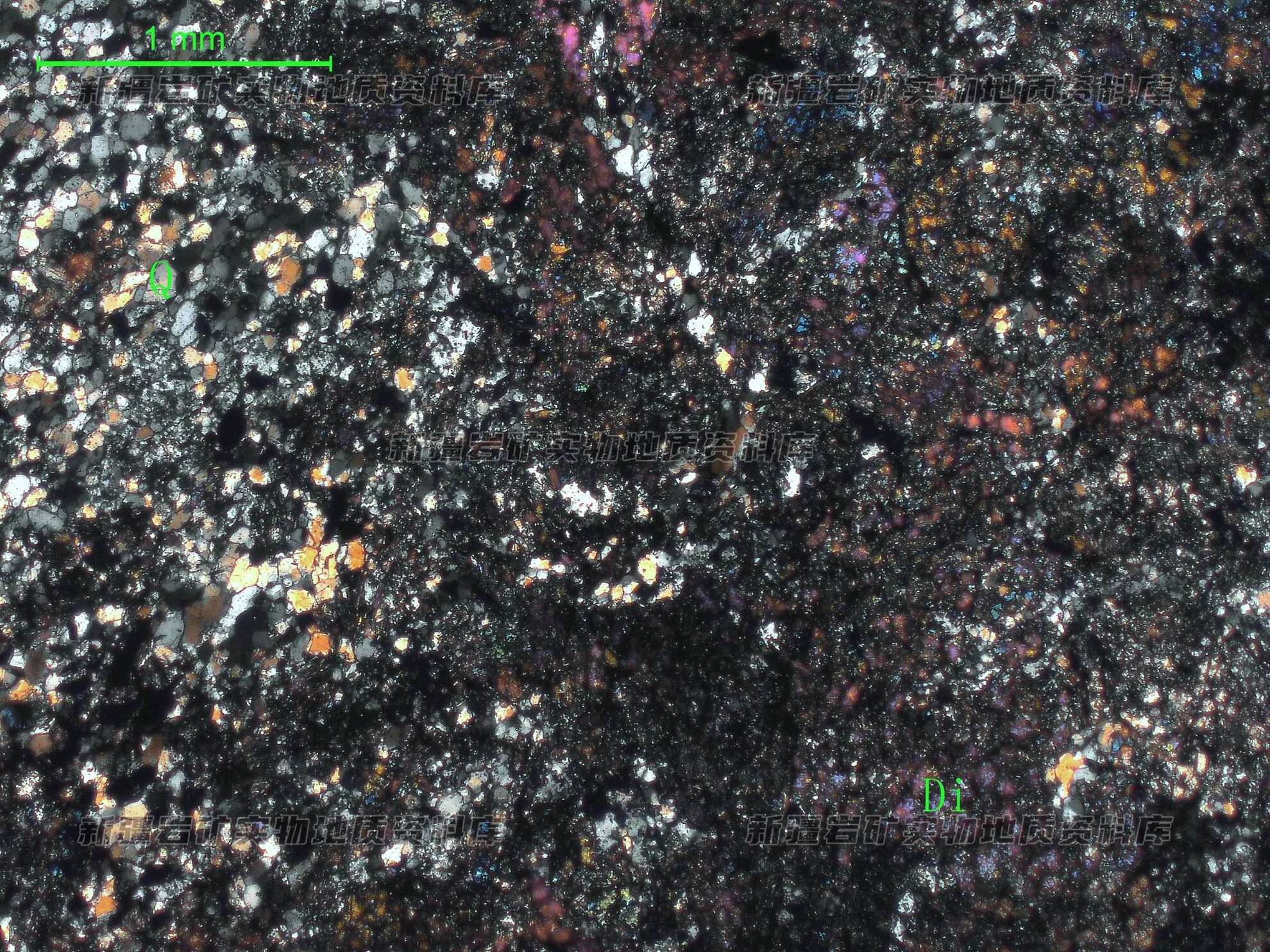 岩石特征描述: 岩石由蚀变矿物透辉石组成,透辉石(Di)呈他形微粒状为主,岩石早期分布有少部分石英脉,石英(Q)脉有碎裂、断裂错位。透辉石,99%,最大粒度0.25mm;斜长石少量;金属矿物,1%,粒度0.03-0.3mm。岩石由蚀变矿物透辉石组成,分布少量斜长石、金属矿物。透辉石呈他形微粒状为主,少量的呈纤柱状,在透辉石之间分布有少量他形粒状斜长石。岩石早起分布有少部分石英脉,石英脉有碎裂、断裂错位,金属矿物呈他形微板状,有的分布在透辉石之间,有的分布在脉状石英之间,但脉状石英之间的金属矿物,也和透辉石共生状分布石英之间。金属矿物应和透辉石同期形成。
