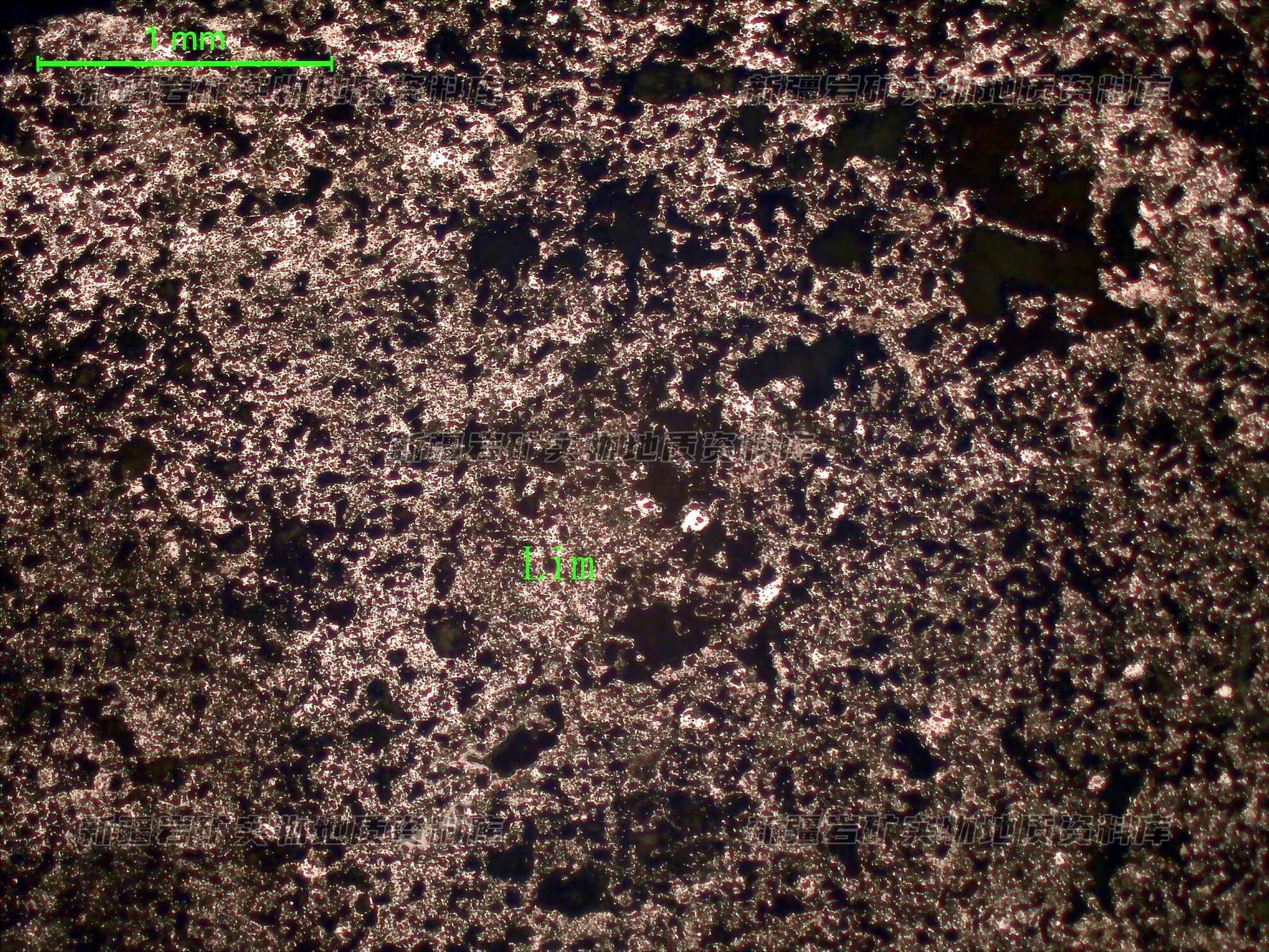 岩石特征描述: 光片中金属矿物由褐铁矿(Lim)组成,褐铁矿呈隐晶状分布,在褐铁矿孔隙之间分布透明矿物,在透明矿物中也嵌布少量褐铁矿。褐铁矿,35%。光片中金属矿物由褐铁矿组成,褐铁矿呈隐晶状分布,在褐铁矿中嵌布有约15%微晶状透明矿物,已铁染,在褐铁矿孔隙之间分布透明矿物,在透明矿物中也嵌布少量褐铁矿。