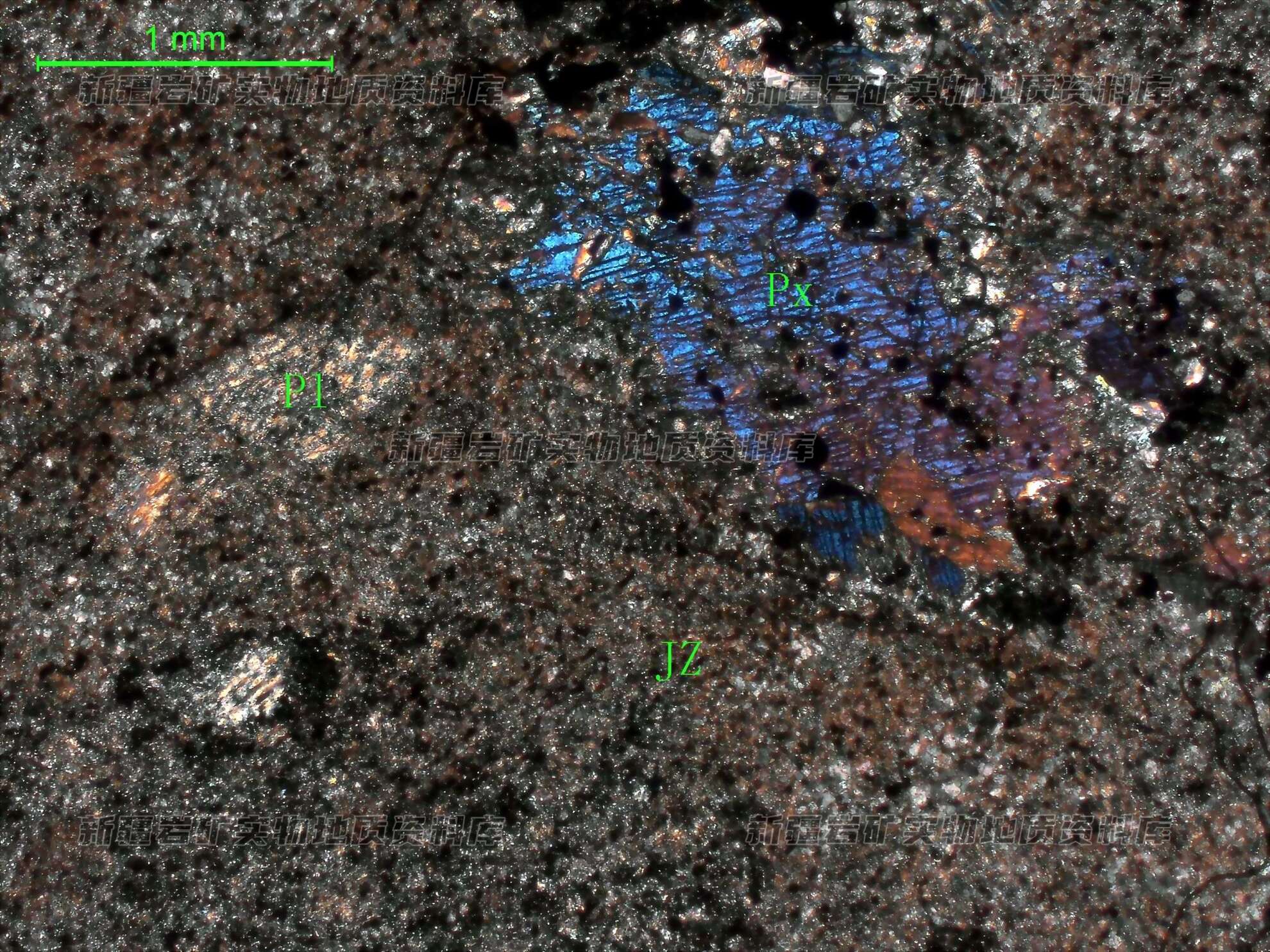 岩石特征描述: 岩石中斑晶辉石(Px)呈他形粒状、柱状,边部有被重结晶矿物交代现象,斑晶斜长石(Pl)呈自形板状,具强绢云母化,轻度黝帘石化。基质(JZ)由细鳞片状黑云母及阳起石组成。黑云母30% 阳起石64% 黝帘石3% 粒度0.1mm 金属矿物3%粒度0.01-0.06岩石的斑状结构还有保留,基质结构已能分辨,但为熔岩结构,斑晶由有斜长石、辉石组成,辉石多于斜长石,共计5%。辉石呈他形粒状、柱状,边部有被重结晶矿物交待现象,微量的暗色矿物已被阳起石替代,斜长石呈自形板状边部多被黑云母熔石交待。斜长石斑晶细于辉石,具强绢云母化,轻度黝帘石化。基质由细鳞片状黑云母及阳起石,分布少量金属矿物及黝帘石。金属矿物多分布在基质中,呈微晶状少量的金属矿物呈细粒状,分布在暗色矿物斑晶中,并且褐铁矿化。根据斑状结构及蚀变矿物组合,原岩为辉石安山岩。