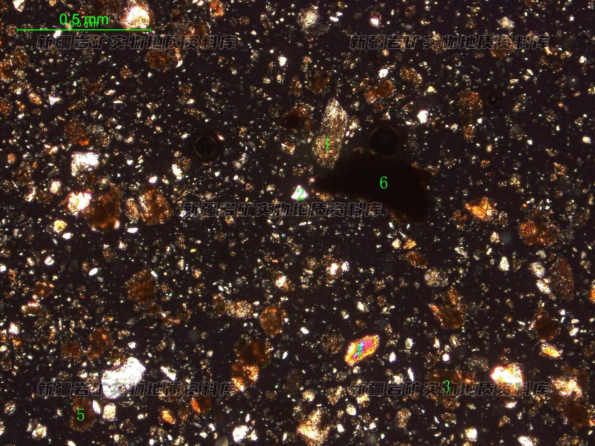 岩石特征描述: 土壤主要由矿物碎屑长石屑(1)、石英屑(2)、岩屑(3)、暗色矿物(4)、含方解石团块(5)及少量金属矿物(6)、泥质组成。