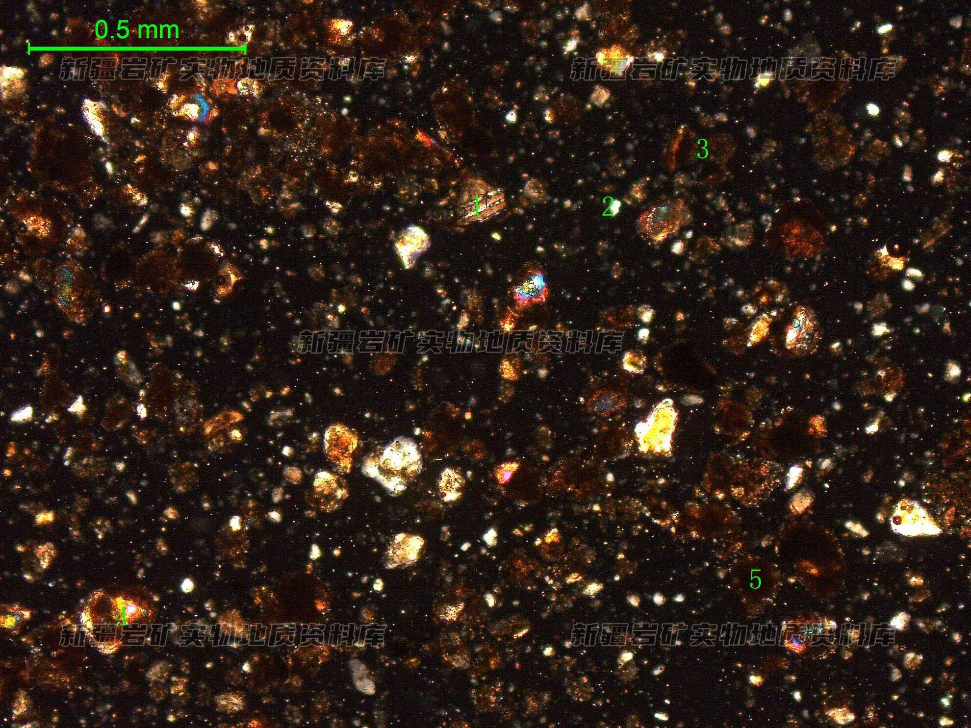 岩石特征描述: 土壤主要由矿物碎屑长石屑(1)、石英屑(2)、岩屑(3)、暗色矿物(4)、含方解石团块(5)及泥质组成。