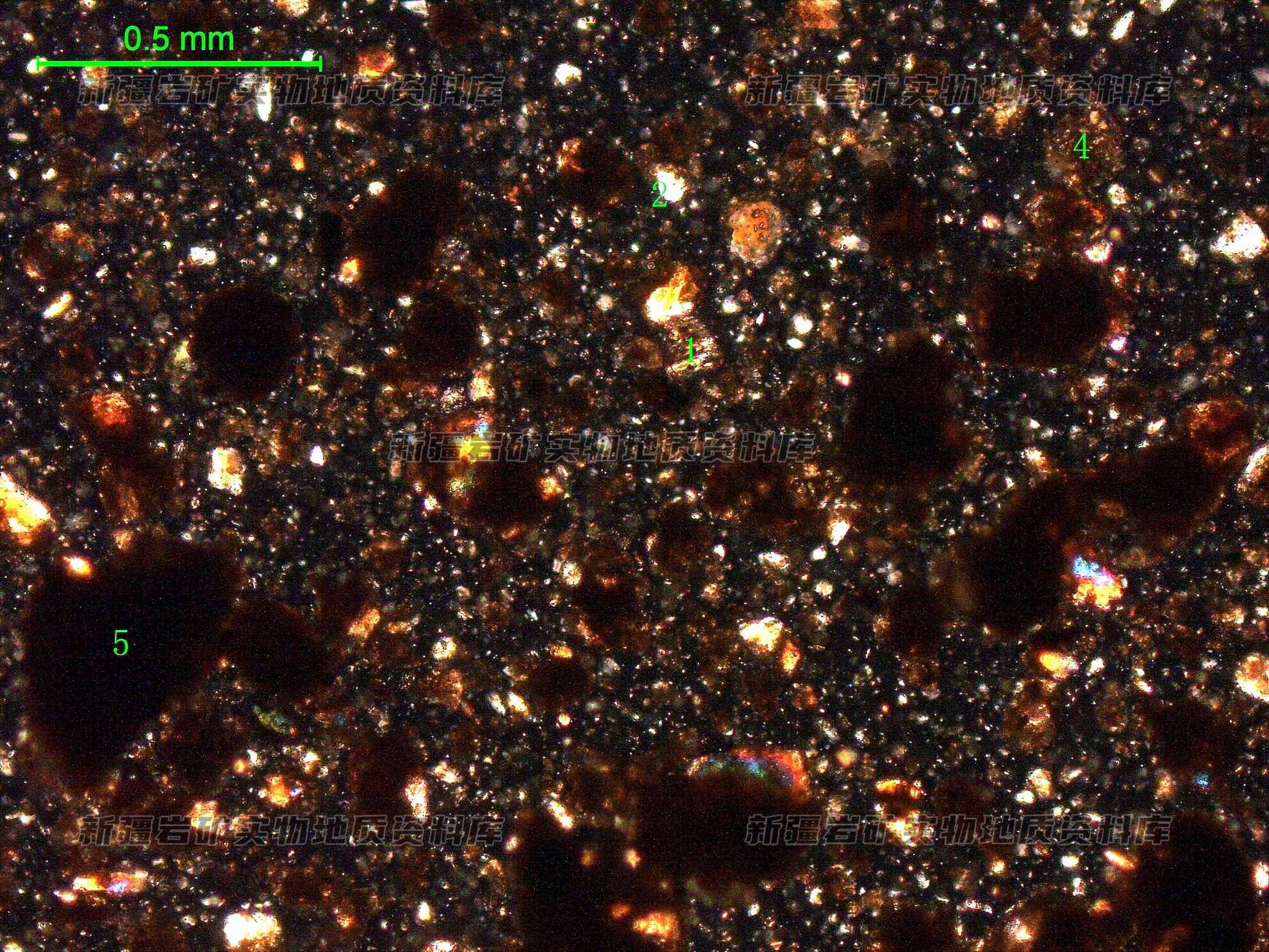 岩石特征描述: 土壤主要由矿物碎屑长石屑(1)、石英屑(2)、岩屑、暗色矿物(4)、含方解石团块(5)及泥质组成。
