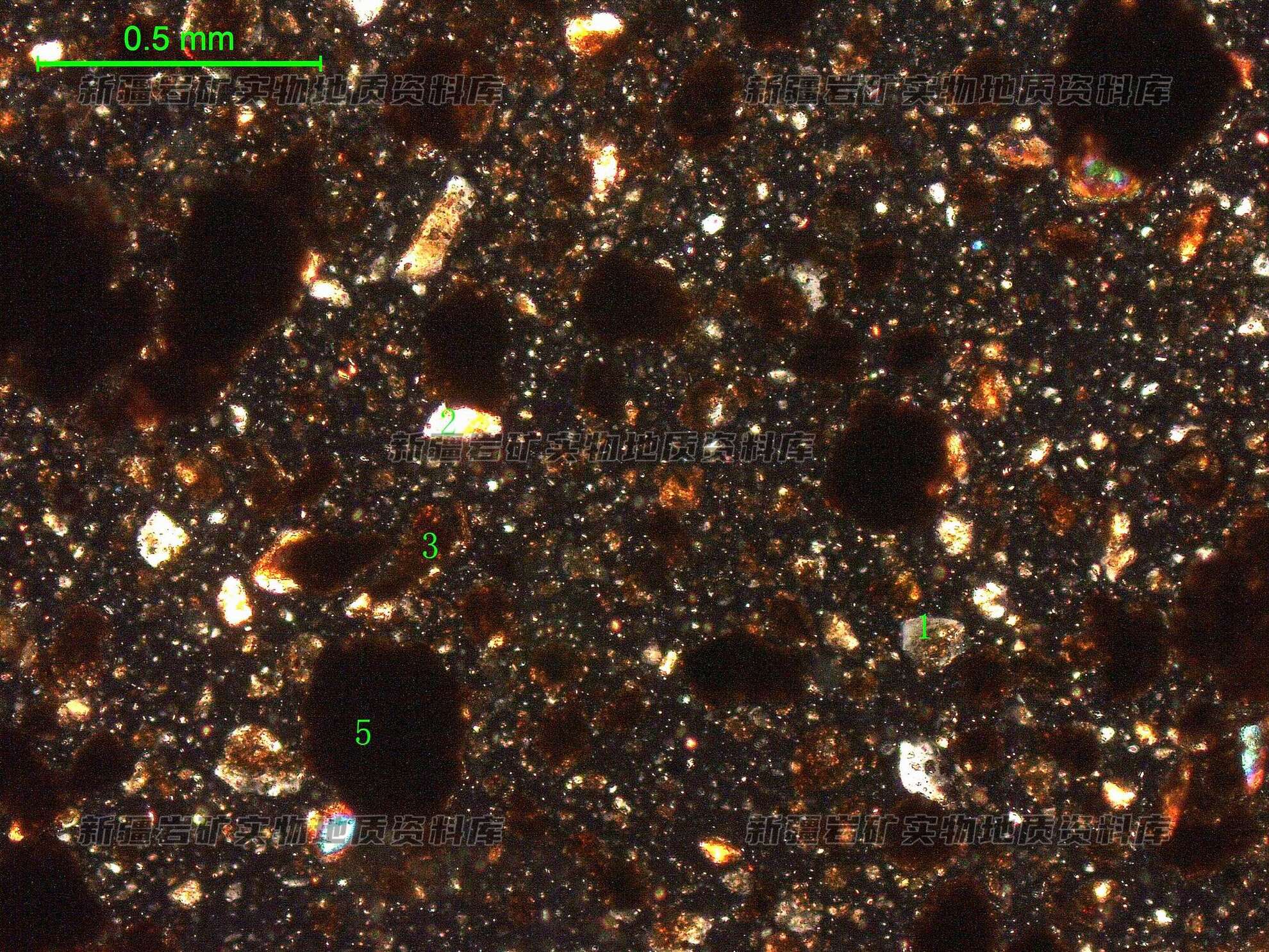 岩石特征描述: 土壤主要由矿物碎屑长石屑(1)、石英屑(2)、岩屑(3)、暗色矿物、含方解石团块(5)及泥质组成。