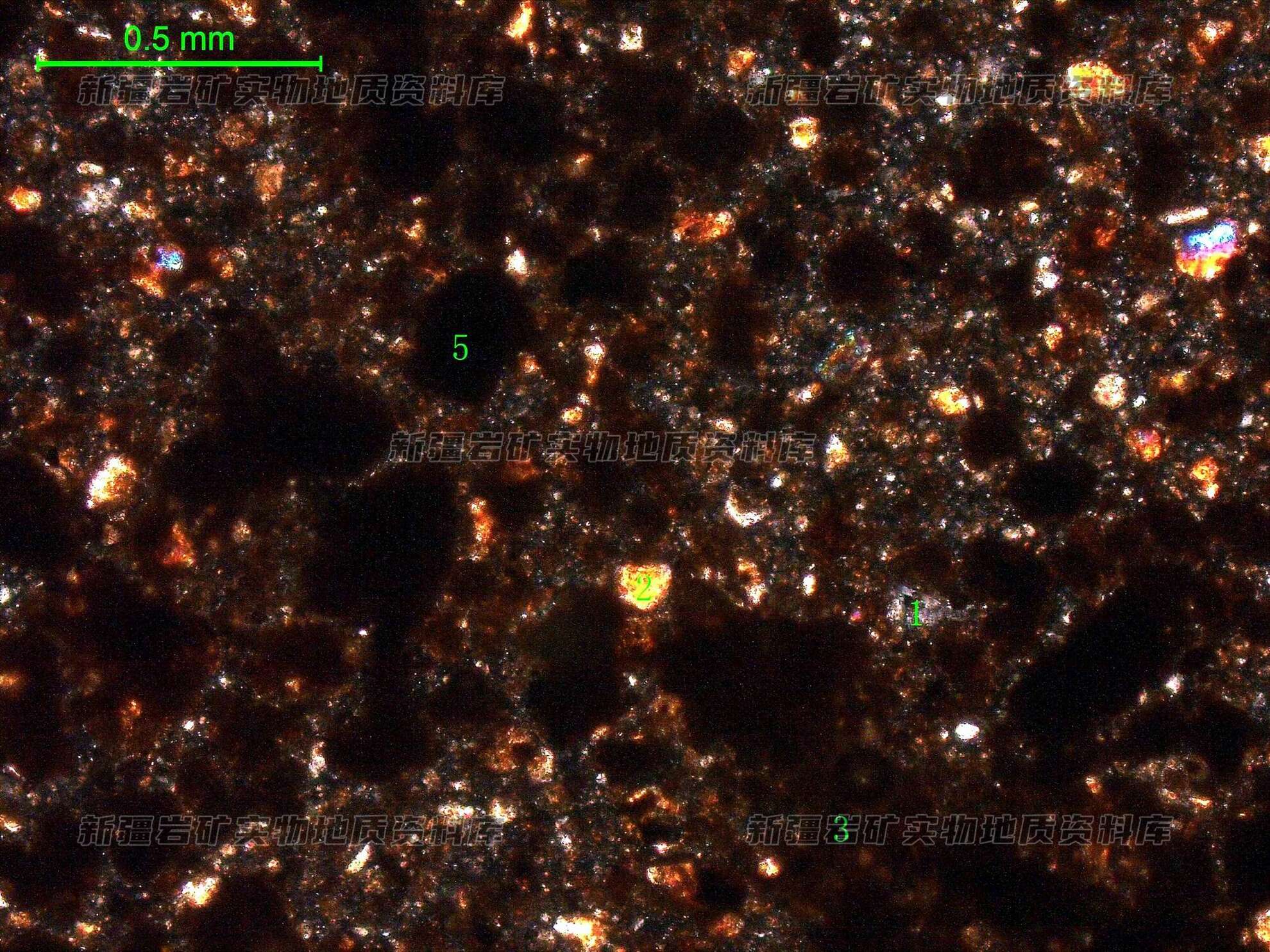 岩石特征描述: 土壤主要由矿物碎屑长石屑(1)、石英屑、岩屑(3)、暗色矿物、含方解石团块(5)及泥质组成。