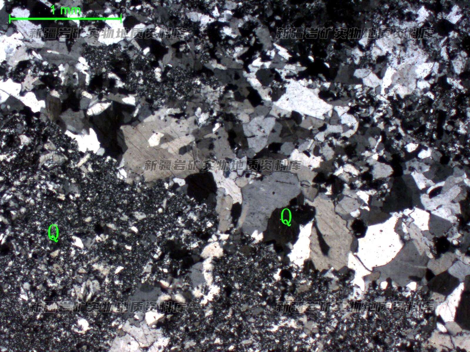 岩石特征描述: 镜下可见隐晶状石英(Q)集合体,粒径微小,后期碎裂化,被硅化石英脉(Q)充填。岩石由隐晶状石英集合体及后期硅化石英组成,前者粒径微小,后期碎裂化,被硅化石英交代,矿物成分为石英及少量长石。镜下可见隐晶状石英粒径小于0.02mm,受应力作用碎裂化、及后期石英充填交代,呈不规则条带状、团块状集合体,约58%,部分呈多边形碎块状;后期石英脉沿裂隙充填,呈不规则脉状、团块状交代原岩,整体含量约40%,后期石英结晶较粗,粒径0.24-1.6mm,呈他形-半自形柱粒状,多具波状消光,其中可见个别长石晶粒,呈他形粒状,表面轻微泥化,含量约2%。