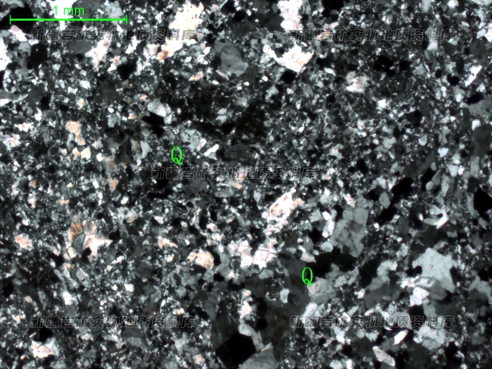 岩石特征描述: 镜下可见隐晶状石英(Q)集合体,粒径微小,后期碎裂化,被硅化石英(Q)充填。岩石由隐晶状石英集合体及后期硅化石英组成,前者粒径微小,后期碎裂化,被硅化石英交代,矿物成分为石英及微量的不透明矿物。镜下可见隐晶状石英粒径小于0.02mm,受应力作用碎裂化、及后期石英充填交代,呈不规则条带状、团块状集合体,镜下含量约45%,部分呈多边形碎块状;后期石英脉沿裂隙充填,呈不规则脉状、团块状交代原岩,整体含量约55%,后期石英结晶略粗,粒径0.02-1.5mm,呈他形-半自形柱粒状,多具波状消光。不透明矿物矿物含量甚微,呈他形细粒状分布在岩石中。