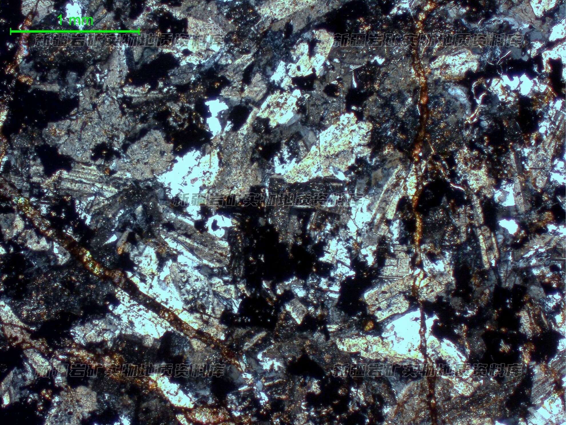 岩石后期有些蚀变,碳酸盐化,遇稀盐酸(5%)剧烈起泡,为方解石,呈细脉状切割岩石,脉宽0.04-0.6mm,含量约4%,脉体中常有铁质及不透明矿物分布。