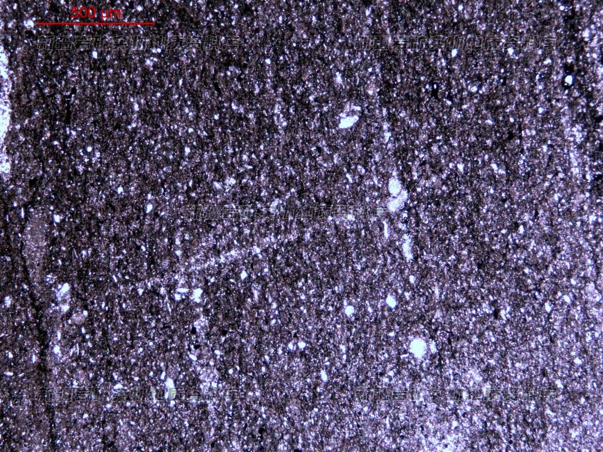 岩石特征描述: 岩石由粉砂屑、胶结物组成,粉砂屑由石英、长石组成,长石多于石英,大部分为细粉砂屑,少部分的为粗粉砂屑,在粉砂屑中分布有少量褐铁矿粉砂屑,另外分布少量细砂屑,粉砂屑的长轴有定向性分布。