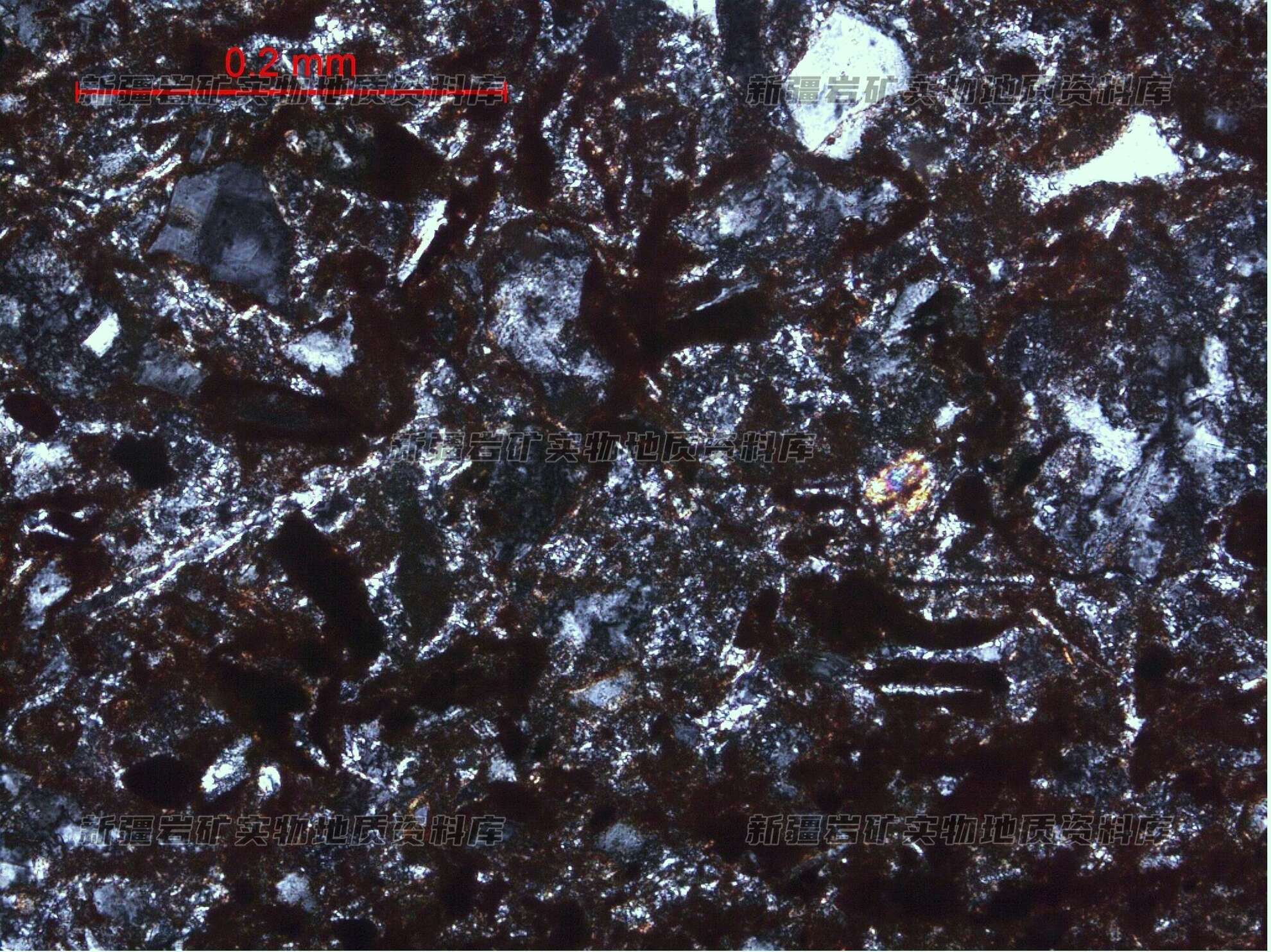主要矿物及含量%: 石英晶屑20,长石晶屑5,玻屑10,杏仁体5,胶结物50,褐铁矿10
