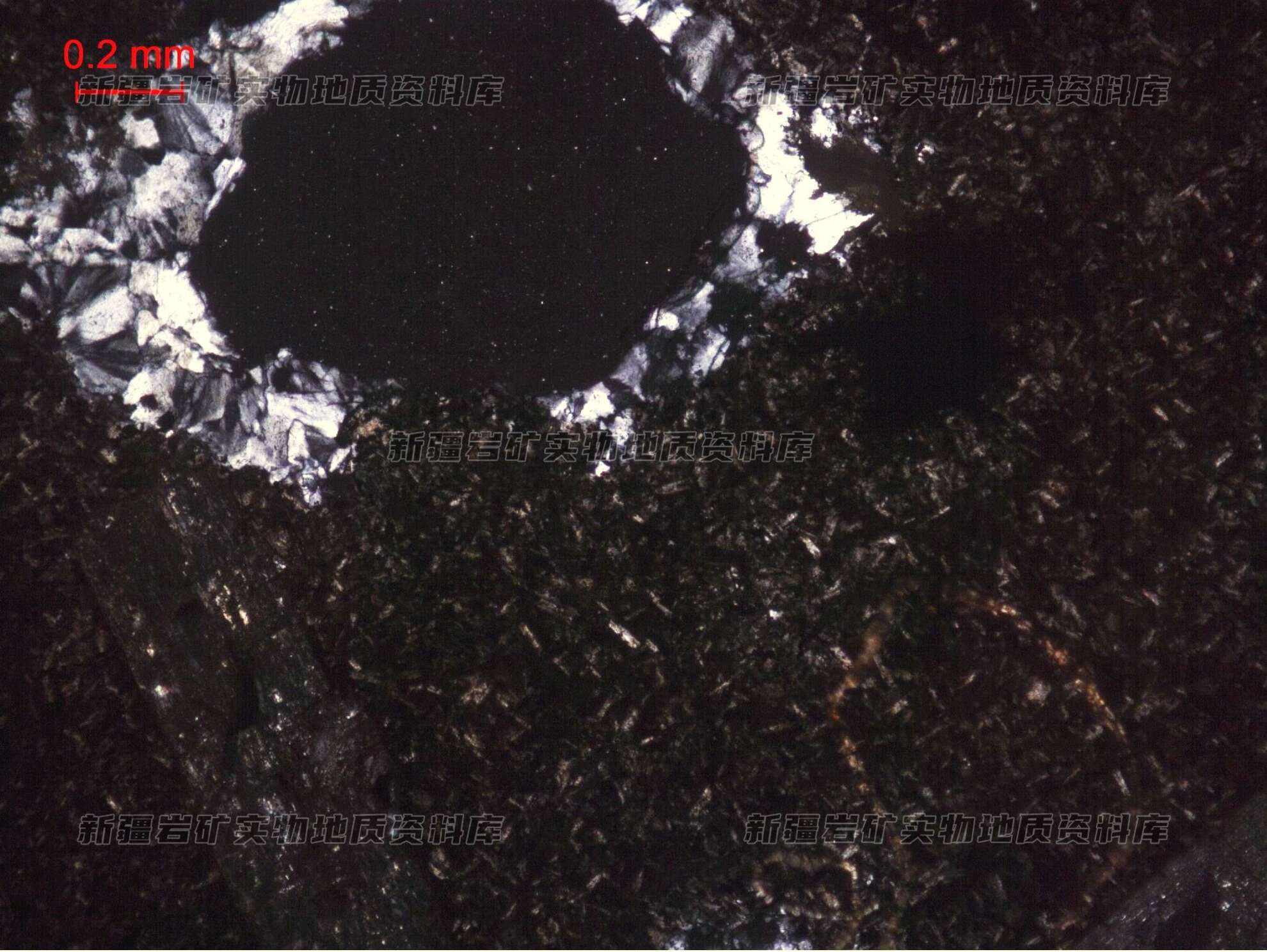 基质具玻晶交织结构,主要为斜长石微晶呈半定向排列,还见斜长石形成三角格架(偏基性),斜长石微晶间可见隐晶质分布。隐晶质多褐铁矿化。