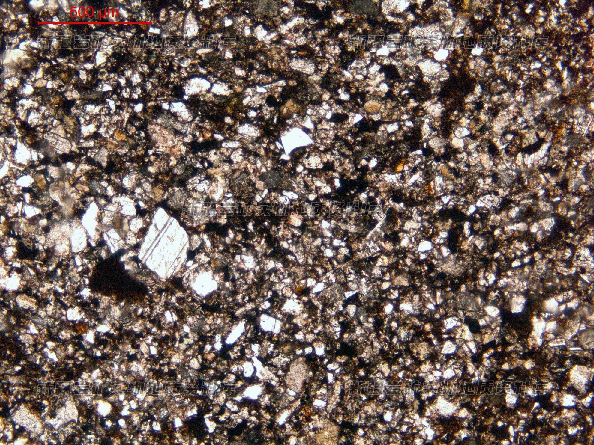 岩石特征描述: 岩石由细碎屑、胶结物组成,细碎屑主要由细砂屑组成,分布少部分粉砂屑,少量的为中砂屑,碎屑主要由岩屑组成,分布少部分长石、微量石英,石英为单晶粒,长石具强泥化,绢云母化,岩屑部分结构已不清晰,具泥化,绢云母化,少部分的具褐铁矿化,褐铁矿化的岩屑多为粉砂岩,少量的推断为玄武岩,另外分布有少量方解石碎屑,胶结物由褐铁矿为主,在褐铁矿中混合分布有少部分碳酸盐。