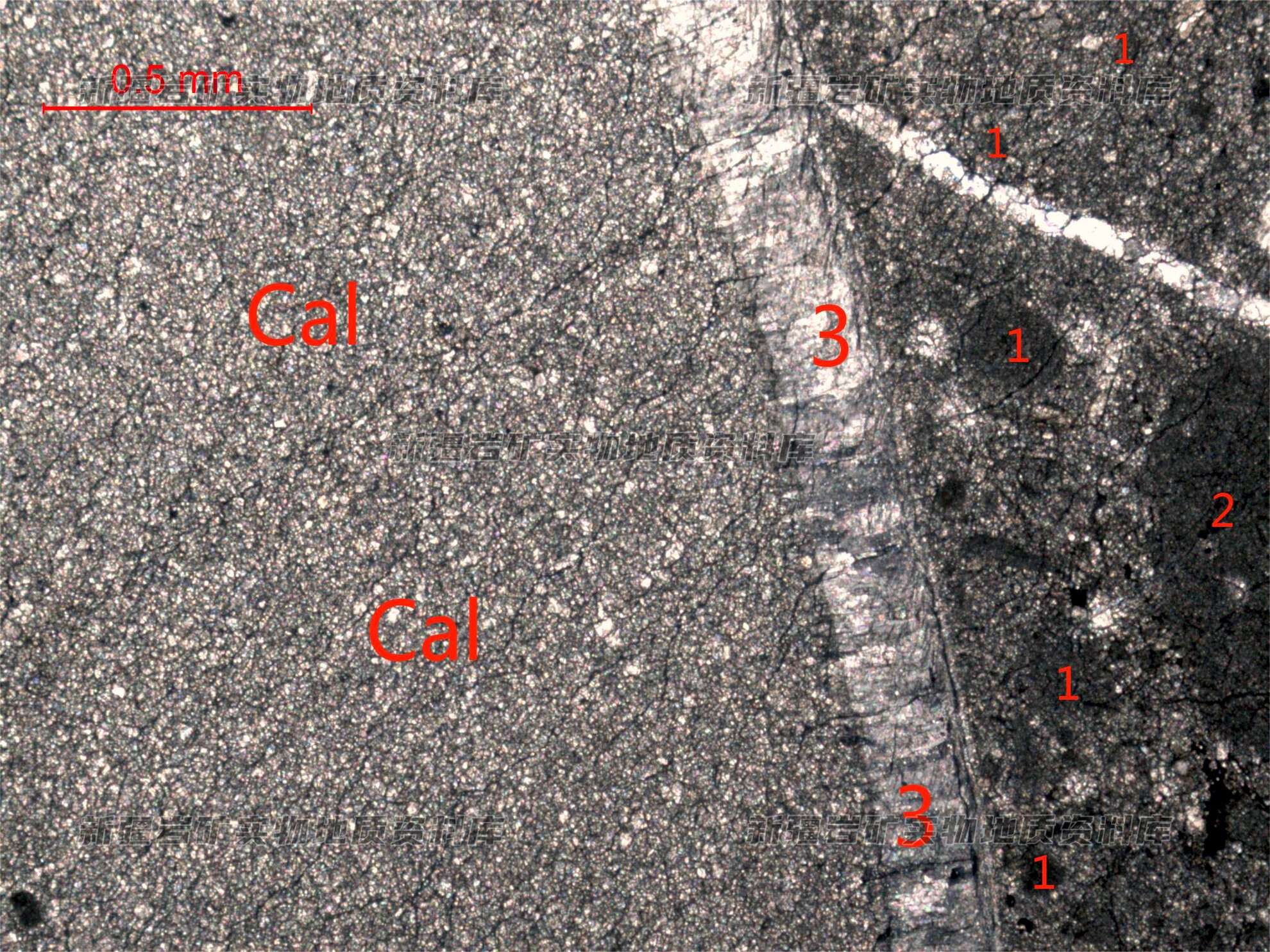 主要矿物及含量%: 方解石92 ,砂屑5,砾屑个别,生物碎屑3