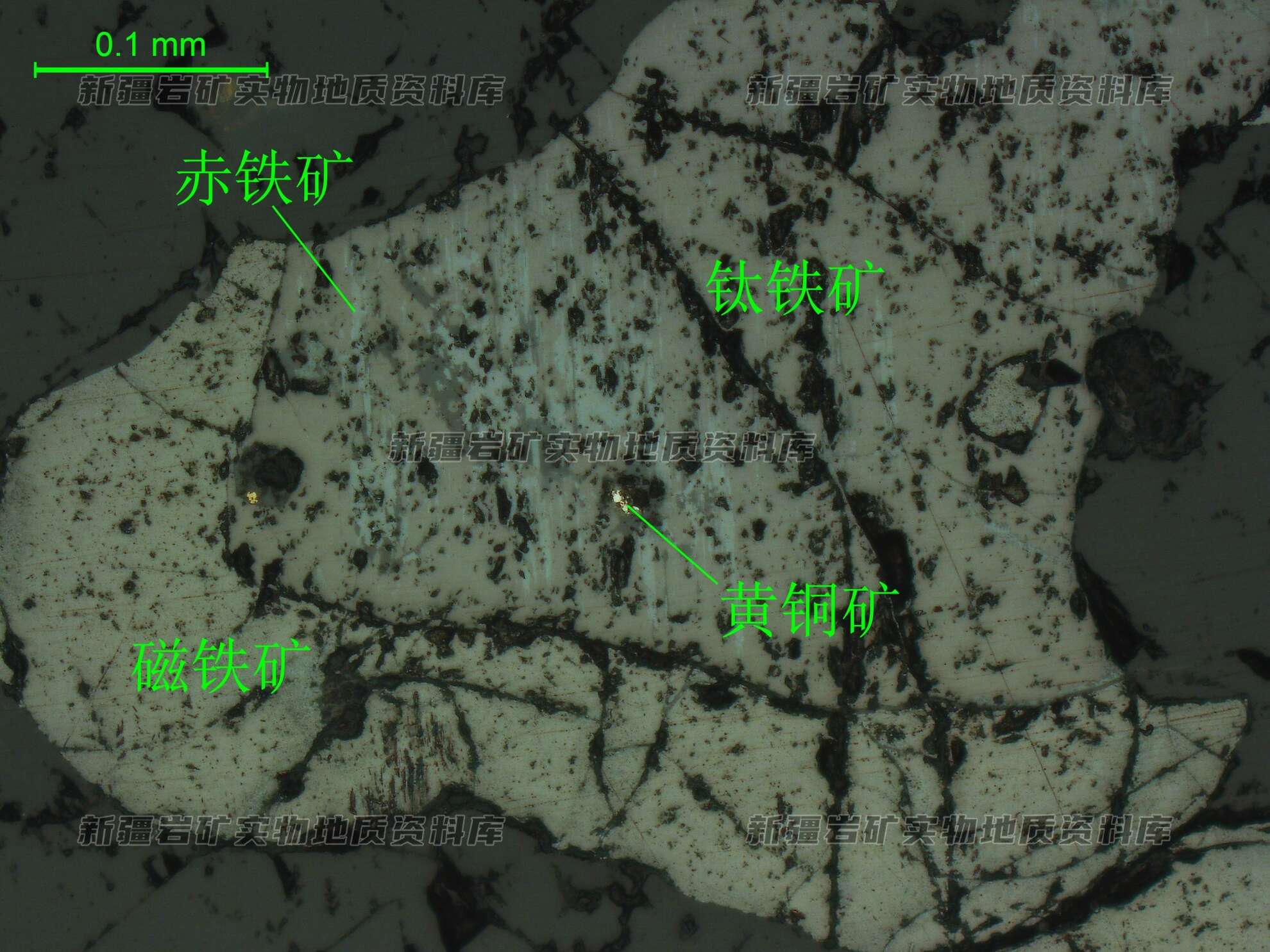钛铁矿与他形磁铁矿连晶状分布,内部包裹微小的黄铜矿,并有叶片状赤铁矿(灰蓝色)分布其中。