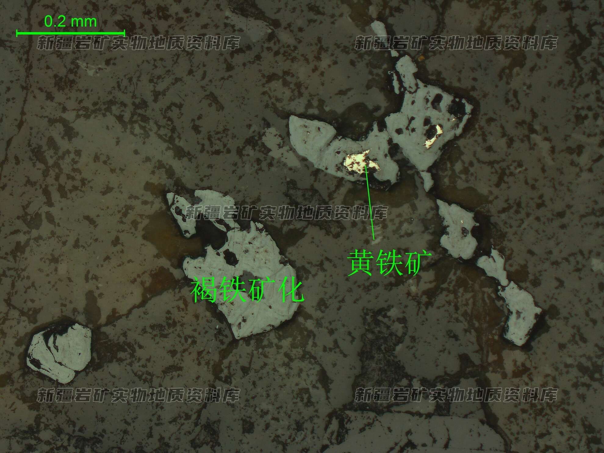 黄铁矿呈他形-半自形粒状晶,单晶或连晶状分布,大部分已褐铁矿化,仅在局部残留。