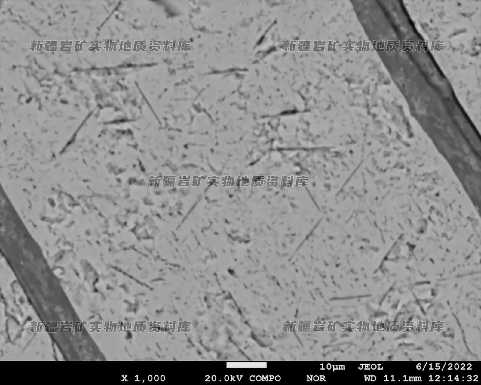 可见磁铁矿中出溶钛铁矿等微小的矿物定向晶片,呈网格状、针状。电子探针BSE-COMPO(背散射成份像)