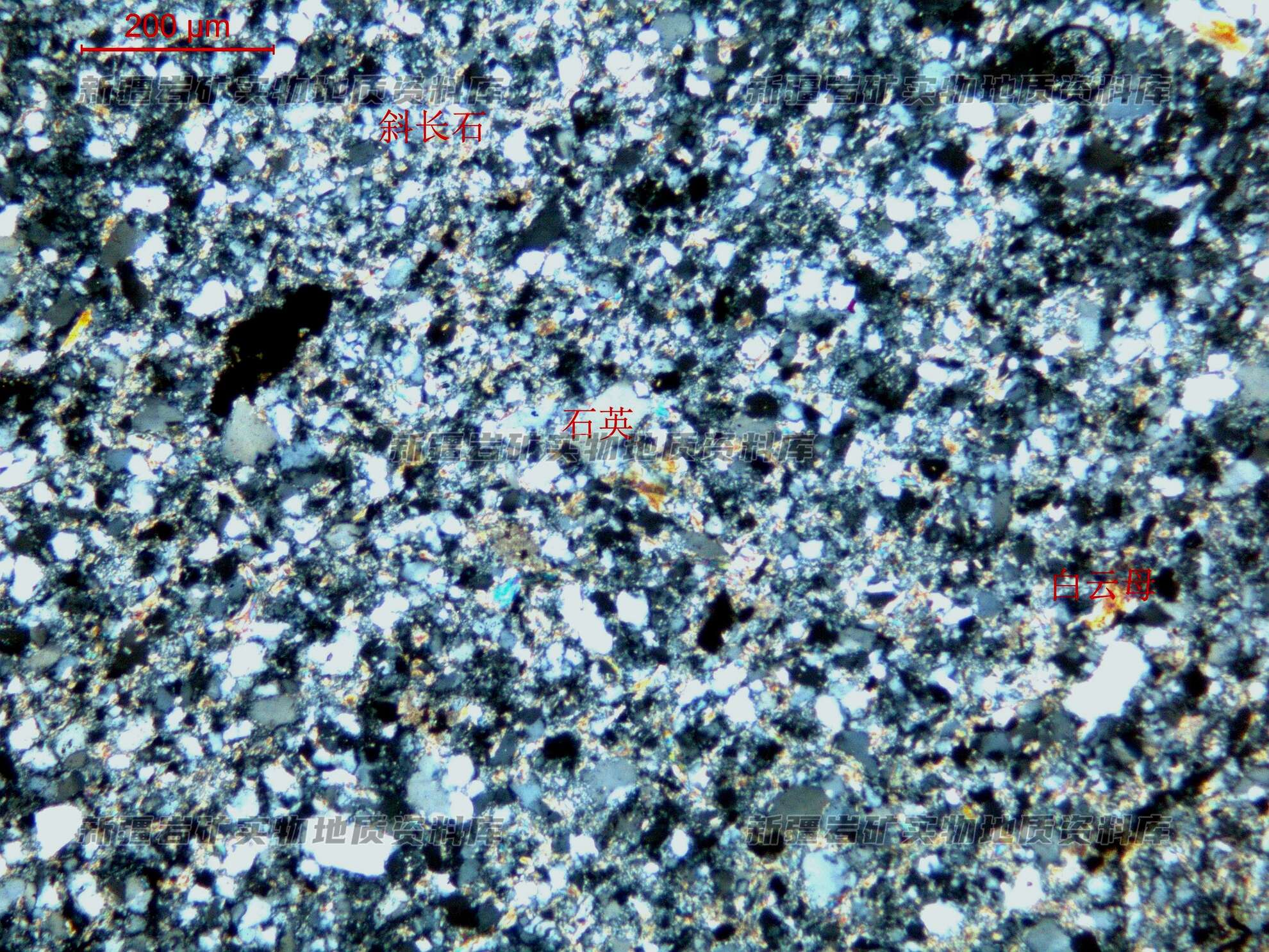基质:斜长石69,石英15,白云母5,金属矿物少量