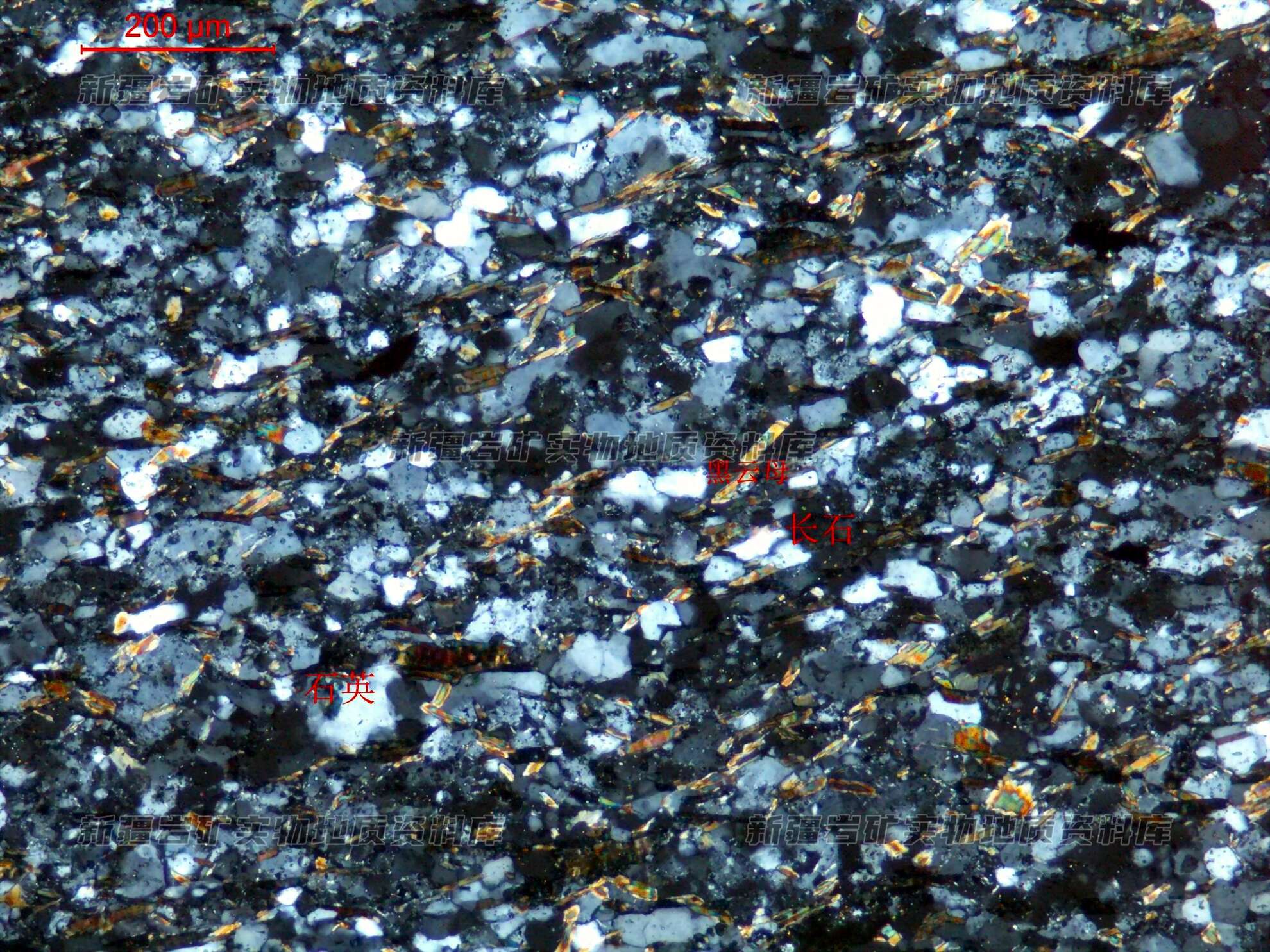 主要矿物及含量%: 斜长石60,石英5,黑云母25,金属矿物微量