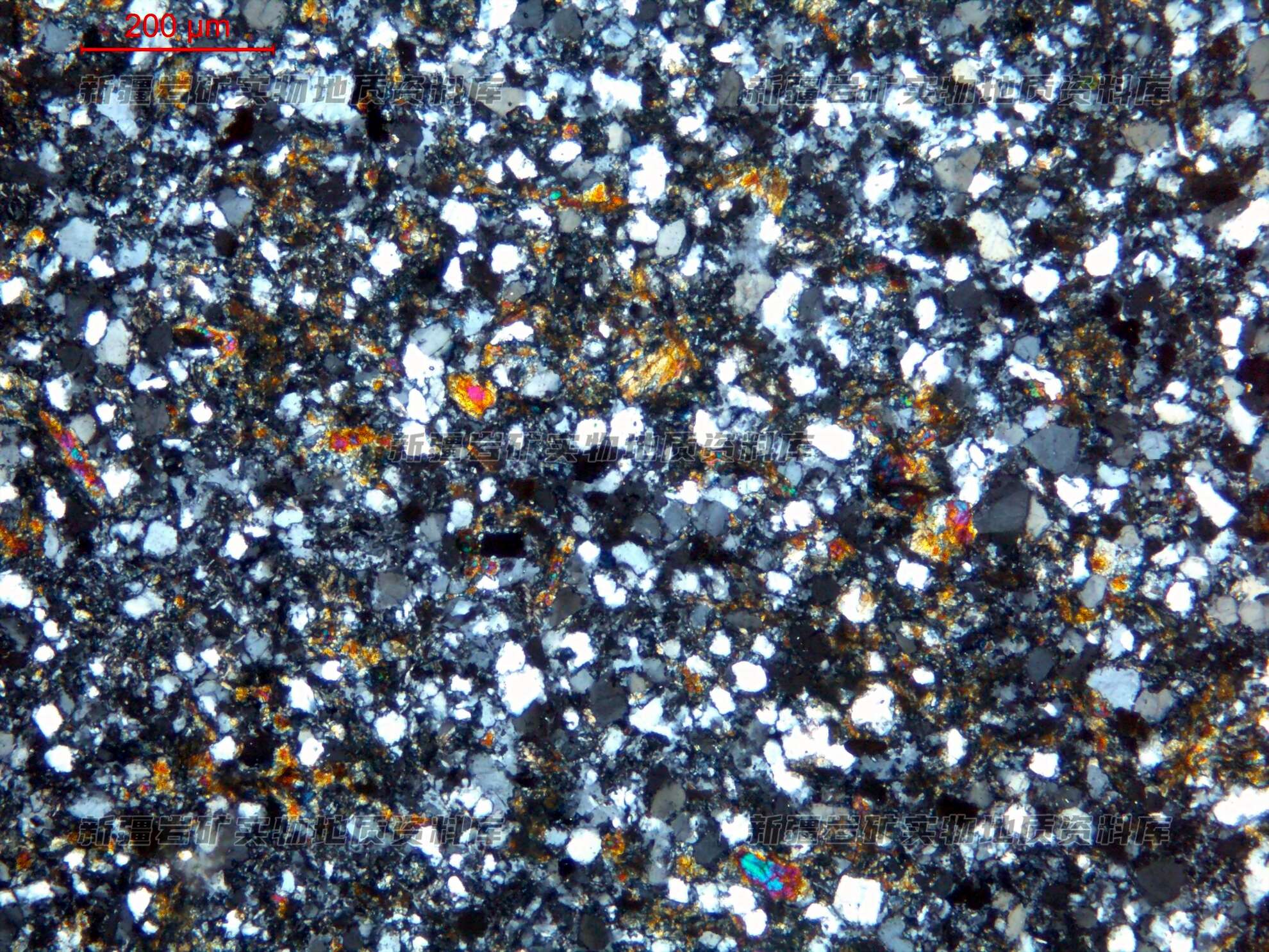 岩石特征描述: 重结晶矿物主要为绿帘石(彩色)、斜长石(灰色)、石英(灰白色)。