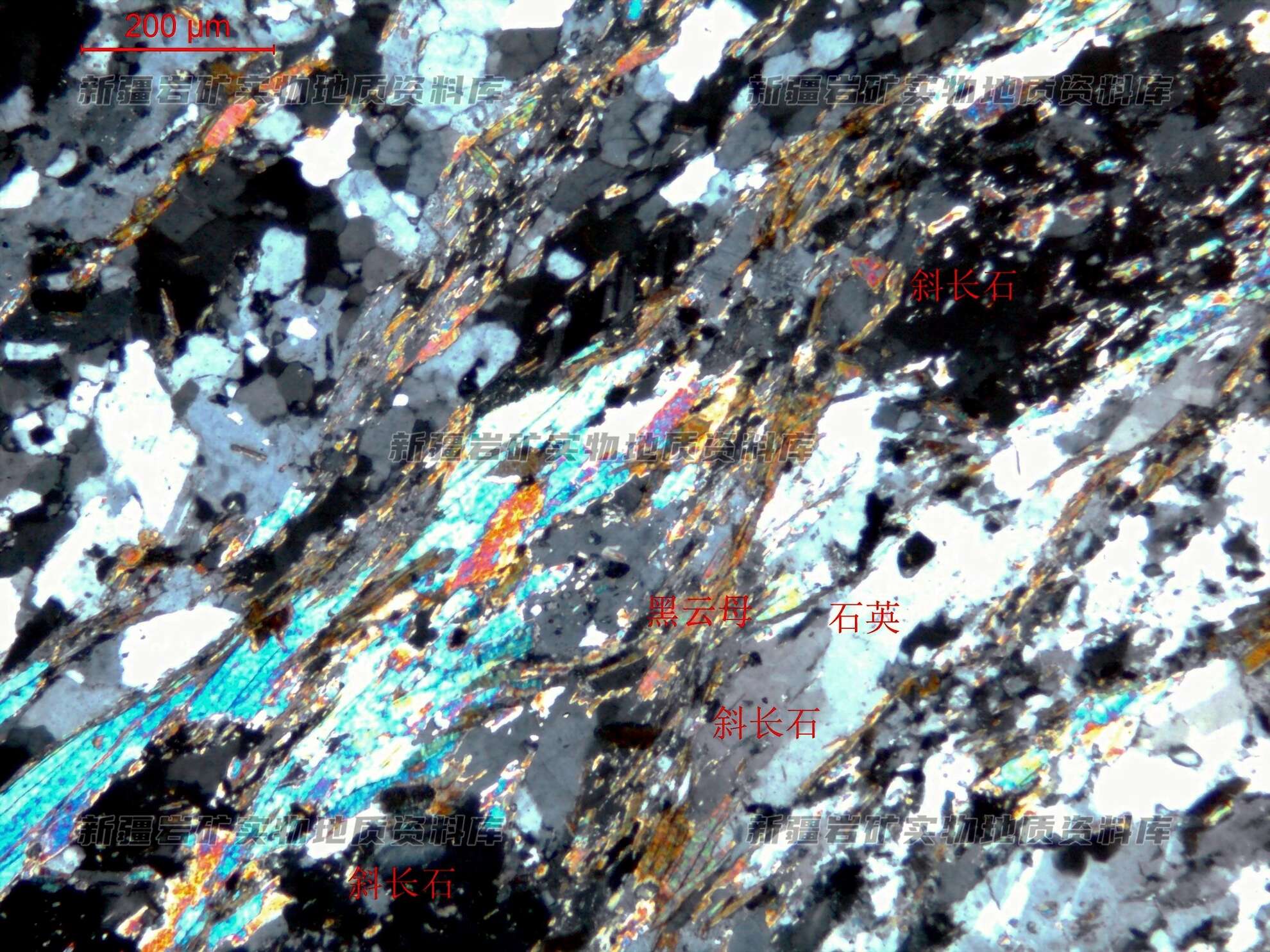 主要矿物及含量%: 斜长石55,石英25,黑云母20,白云母少量,金属矿物微量