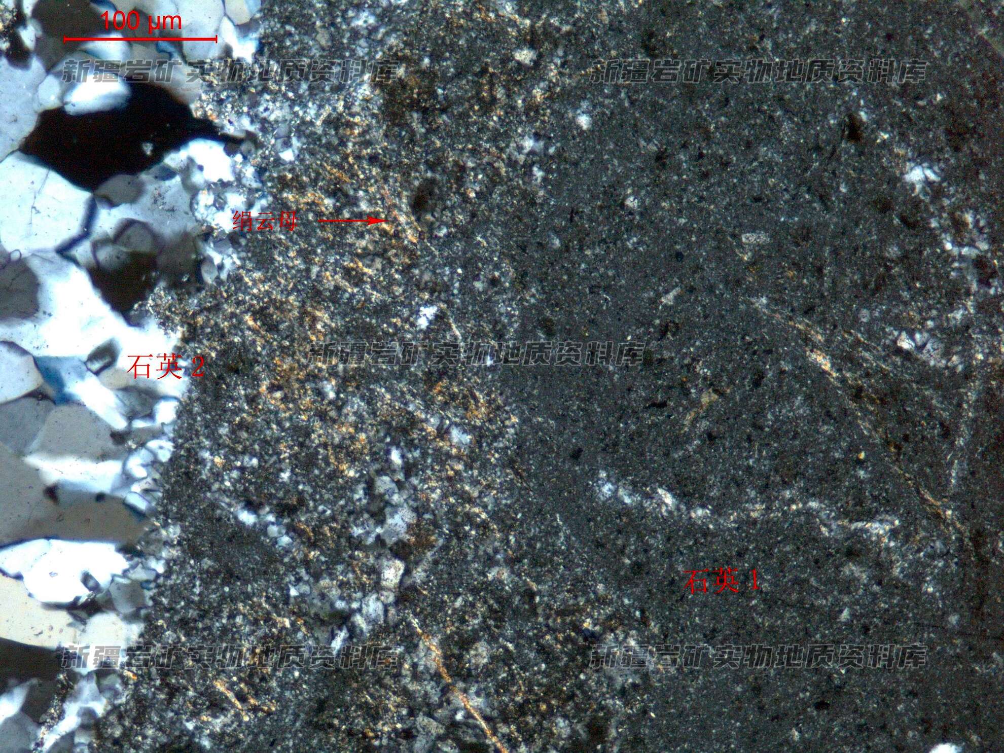 岩石特征描述: 细粒石英为脉状石英2,隐晶状石英1为原岩硅质成分。箭头所指为裂隙状绢云母。