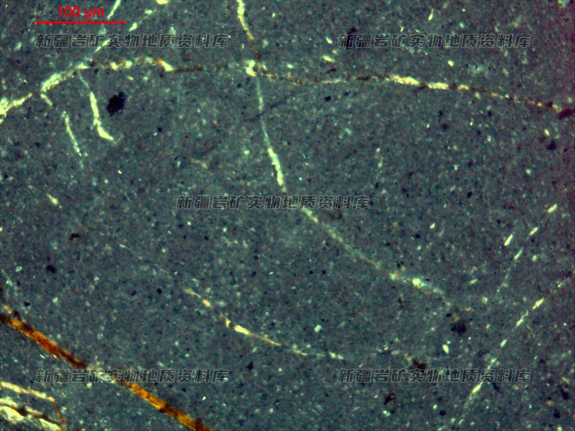 由泥硅质组成,呈隐晶状分布,在泥硅质中分布少量粉砂屑及放射虫,微裂隙由碳酸盐组成。照片中放射虫没有显示。