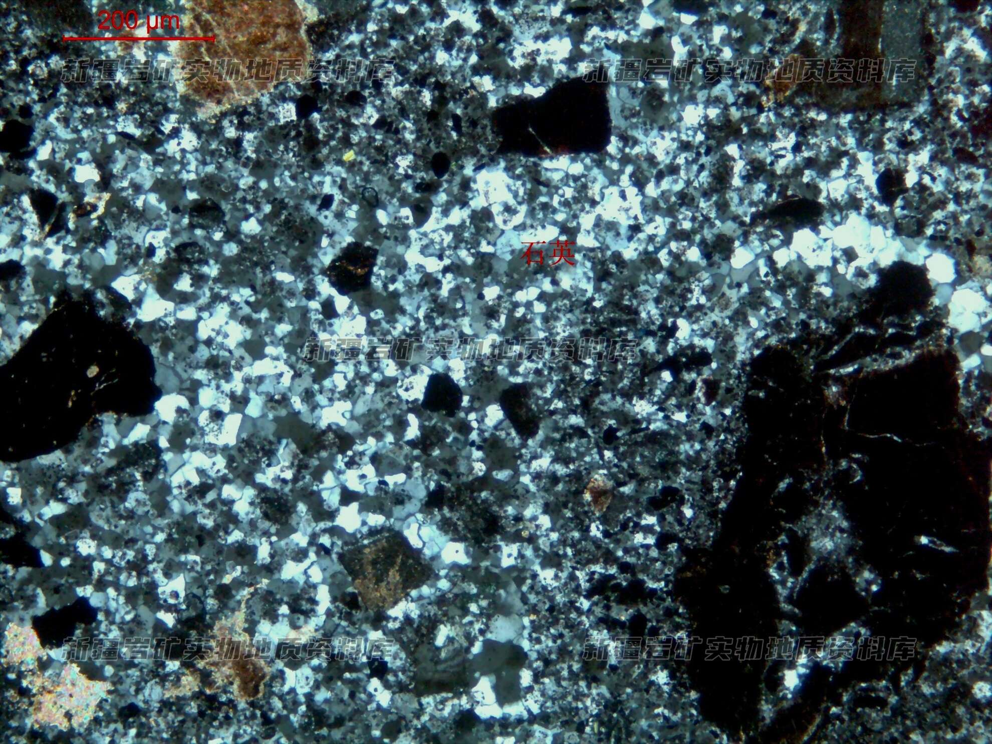岩石特征描述: 岩屑由泥硅质岩、砂岩、放射虫、硅质岩组成,胶结物已由后期微粒状石英组成。放射虫硅质岩为砾石,照片中未显示。