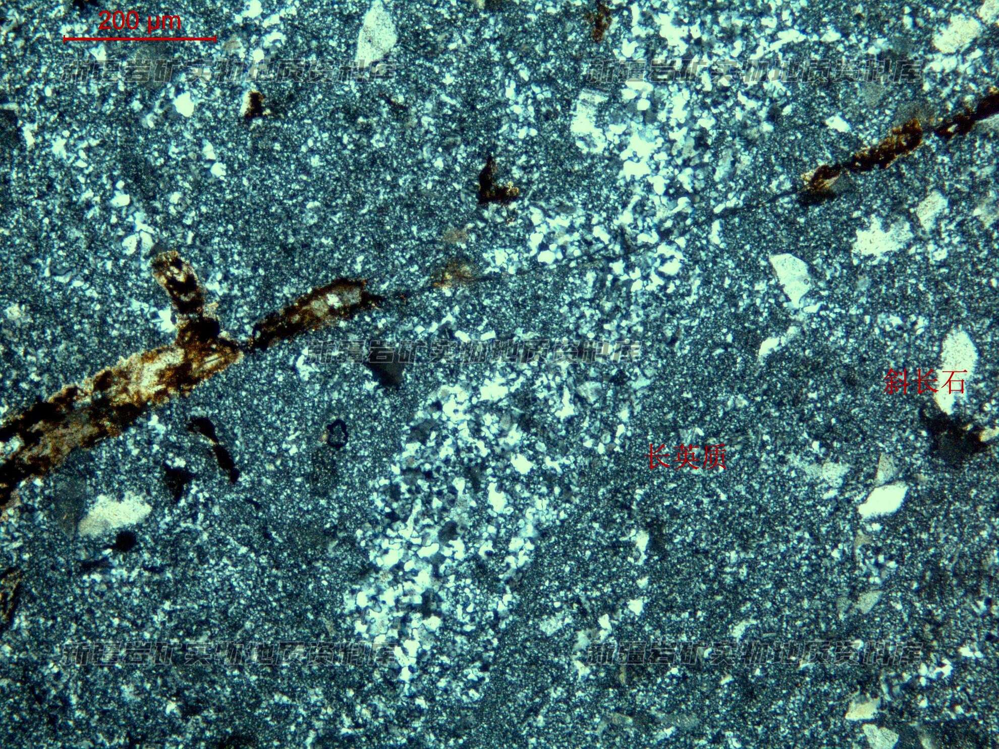 岩石特征描述: 单偏光下还可分辨玻屑形态,已由重结晶长英质为主组成,分布少部分斜长石晶屑。