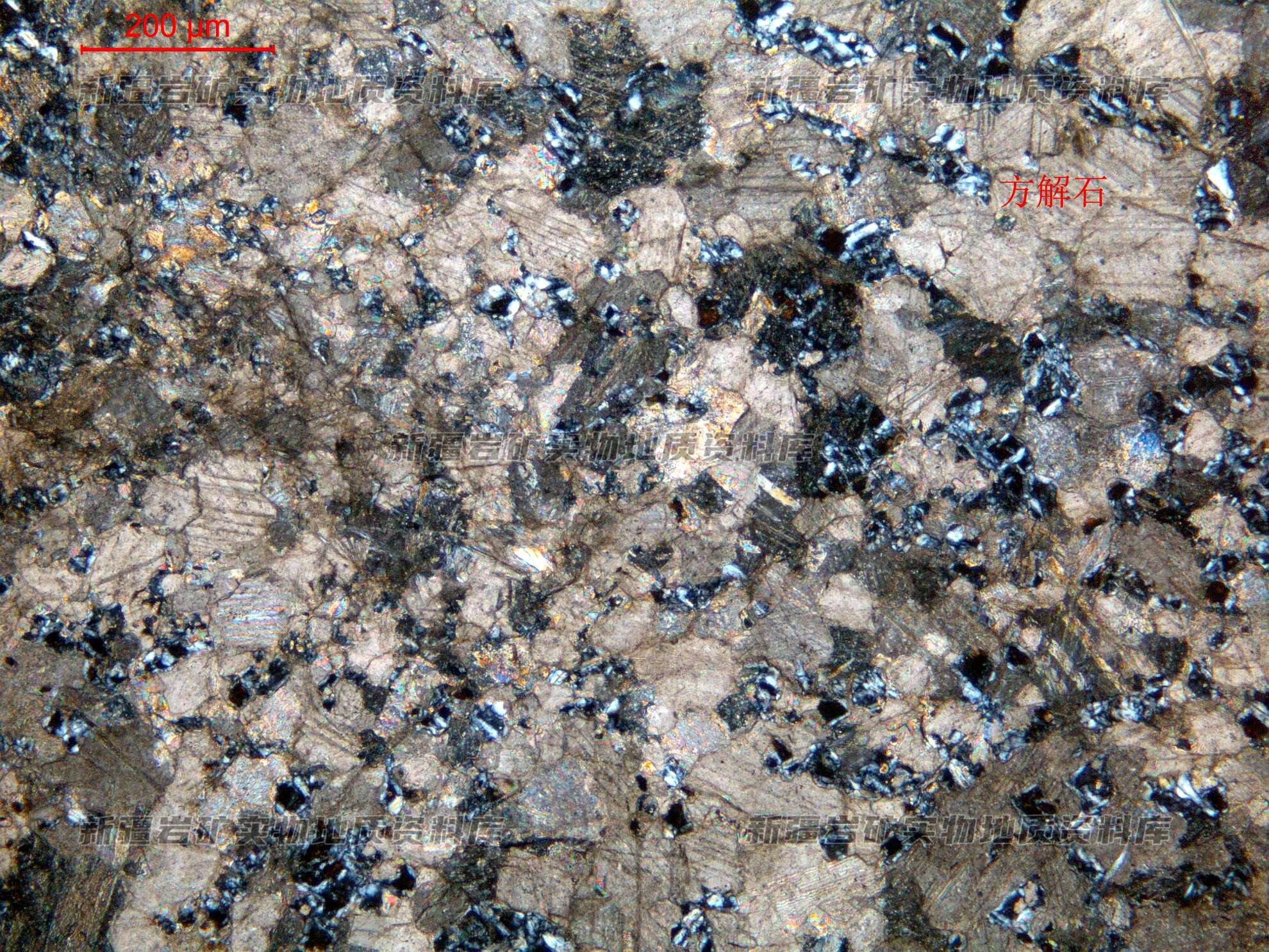 岩石特征描述: 主要由他形粒状方解石组成,在方解石之间分布细纤柱状透闪石。(灰白色)方解石85% 粒度0.1-0.5mm 透闪石15% 白钛石少量 粒度0.03-0.1mm岩石主要由方解石组成,分布少部分透闪石,少量白钛石,方解石呈他形粒状镶嵌状分布,少量的方解石为原岩的裂隙脉状方解石分布,在方解石之间,分布少部分纤维状透闪石,其透闪石有被方解石交代现象,白钛石呈他形粒状,多分布在透闪石之间,从成分看,为大理岩,其大理岩推断为碳酸盐交代基性岩形成。