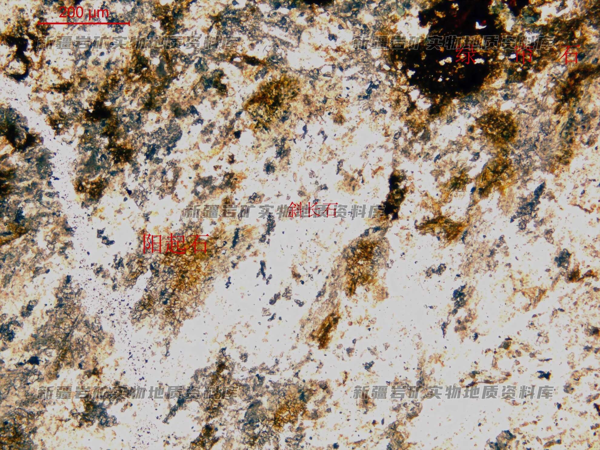 岩石特征描述: 岩石的原结构大致可分辨,白色为斜长石微粒集合体,外形还大致保留,在斜长石之间分布纤维状阳起石集合体,集合体不规则,在阳起石分布微粒状集合体绿帘石。(深褐色)斜长石 65% 粒度最大0.4mm 阳起石15% 绿帘石20% 金属矿物少量 岩石的矿物成分还可大致分辨,结构已被破坏,主要为碎裂作用,并叠加片理化,斜长石都已粒化、粉化,呈碎粒状集合体分布,有的集合体还可分辨为斜长石板状外形,但内部已有粉化、粒化的微粒集合体组成,从残存的结构推断,原岩应为粒状结构,暗色矿物已被隐晶状绿帘石、阳起石集合体组成,也有的还显粒状外形轮廓,由此推断原岩应为闪长岩类岩石,碎裂作用叠加片理化,碎粒集合体长轴具大致定向性分布,金属矿物已褐铁矿化,由碎粒集合体组成,分布碎粒状长石暗色矿物之间。