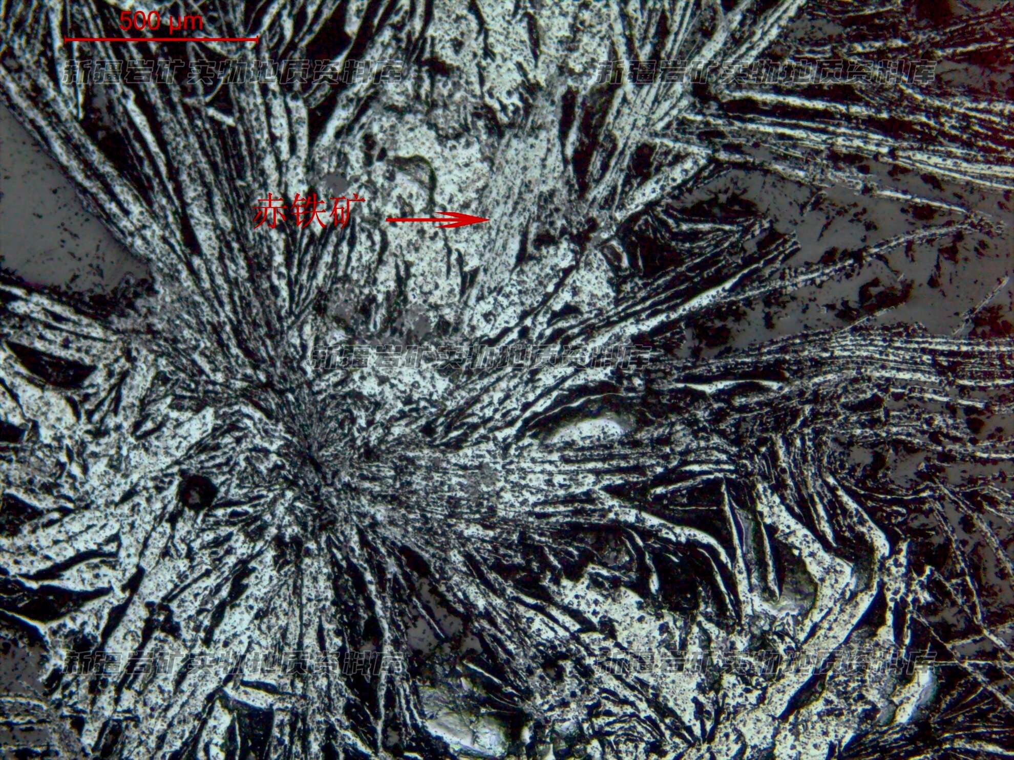岩石特征描述: 金属矿物赤铁矿呈板状、针板状、放射集合体状分布,少量的板状赤铁矿向镜铁矿转变。