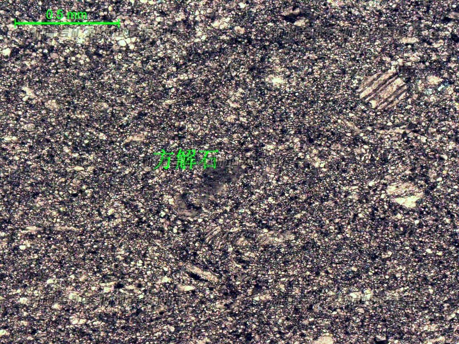 岩石特征描述: 岩石主要由方解石组成,方解石大多呈微晶粒状,少数粒径稍粗,由于方解石粒径的差异,稍显定向、条带状分布。岩石具微晶结构,主要由细小的方解石组成,遇稀盐酸(5%)剧烈起泡。镜下可见岩石矿物组成单一,主要由方解石组成,方解石大多呈微晶粒状,整体含量约94%,大多粒径0.004-0.03mm,少数粒径稍粗呈粉晶状,粒径0.03-0.06mm,微晶、粉晶方解石之间紧密镶嵌分布。在微小的方解石集合体之间,可见粒径较粗的方解石晶粒及集合体,呈单晶粒状或透镜状、团块状分布,直径0.2mm至数毫米不等,整体含量约6%。透明矿物间散布微小的不透明矿物,含量极微。
