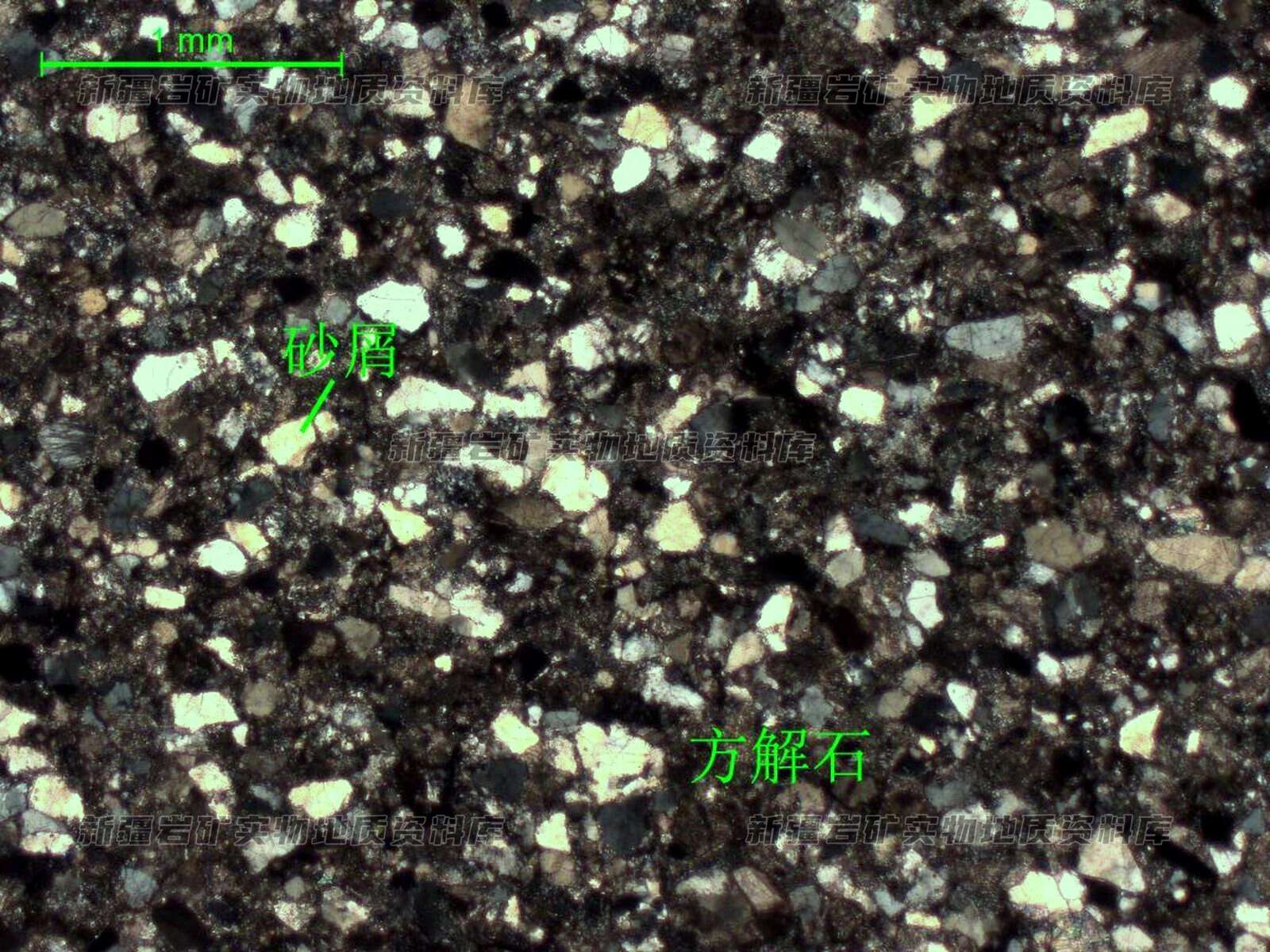 岩石特征描述: 岩石具含砂质细晶结构,主要由方解石和细砂屑组成,二者含量相近,细砂屑多呈次棱角状,成分以长英质矿物为主、次为硅质岩屑。岩石具含砂质细晶结构,主要由方解石和细砂屑组成,二者含量相近,为灰岩向砂屑过渡的类型,遇稀盐酸(5%)剧烈起泡。镜下可见细砂屑多呈次棱角状,成分以长英质矿物为主、次为硅质岩屑,粒径多在0.06-0.25mm,多为细砂屑,个别粒径稍粗,整体含量约45%,其间散布少量绢云母,呈细小鳞片状,含量约1%;砂屑之间分布方解石晶粒,粒径多在0.02-0.25mm,以细晶方解石为主,含量约52%。不透明矿物呈他形微小粒状,较均匀散布在透明矿物之间,含量约2%。