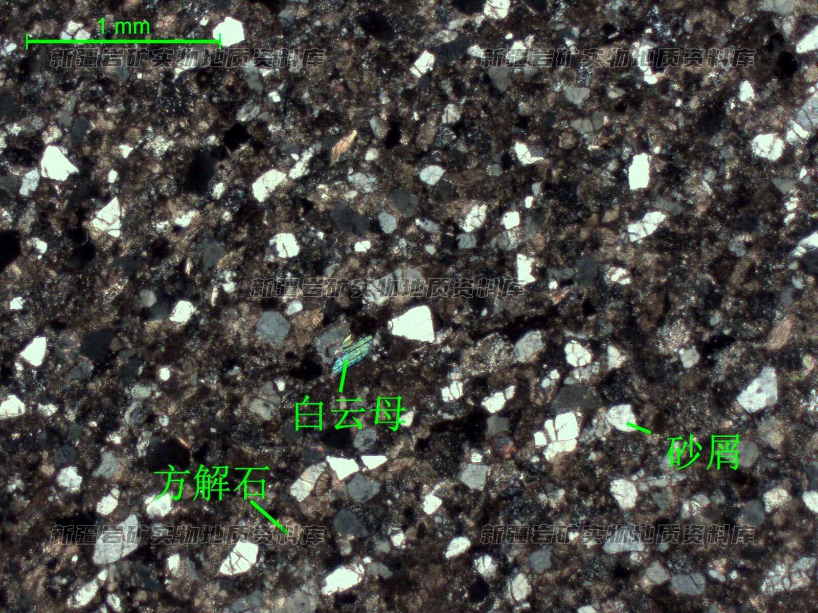 岩石特征描述: 岩石具含砂质细晶结构,主要由方解石和细砂屑组成,二者含量相近,细砂屑多呈次棱角状,成分以长英质矿物为主、次为硅质岩屑。岩石具含砂质细晶结构,主要由方解石和细砂屑组成,二者含量相近,为灰岩向砂屑过渡的类型,遇稀盐酸(5%)剧烈起泡。镜下可见细砂屑多呈次棱角状,成分以长英质矿物为主、次为硅质岩屑,岩屑的磨圆度稍好,呈次圆状,粒径多在0.06-0.25mm,多为细砂屑,个别粒径稍粗,整体含量约46%,其间散布少量绢-白云母,呈鳞片状、叶片状,含量约1%;砂屑之间分布方解石晶粒,粒径多在0.02-0.25mm,以细晶方解石为主,含量约52%。不透明矿物呈他形微小粒状,较均匀散布在透明矿物之间,含量约1%。