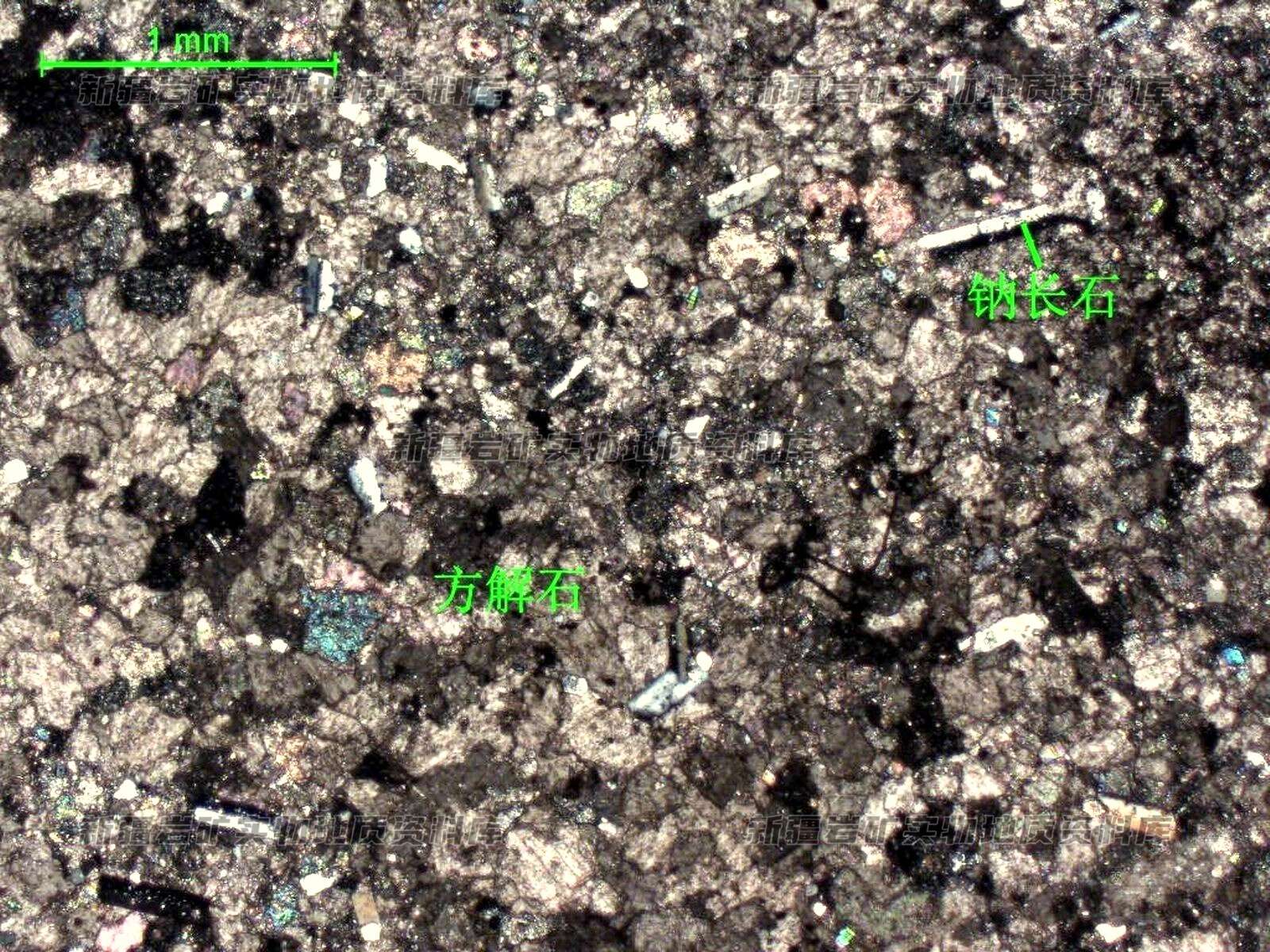 岩石特征描述: 岩石具粒状结构,块状构造,主要由方解石组成,含少量钠长石。方解石呈半自形-他形粒状,粒径0.08-0.5mm,紧密堆积,粒间界限清晰,局部粒径较大。含量94%;见钠长石呈自形-半自形柱状,粒径0.2-0.95mm,多见明显双晶,岩石中分布较为均匀,含量约6%。