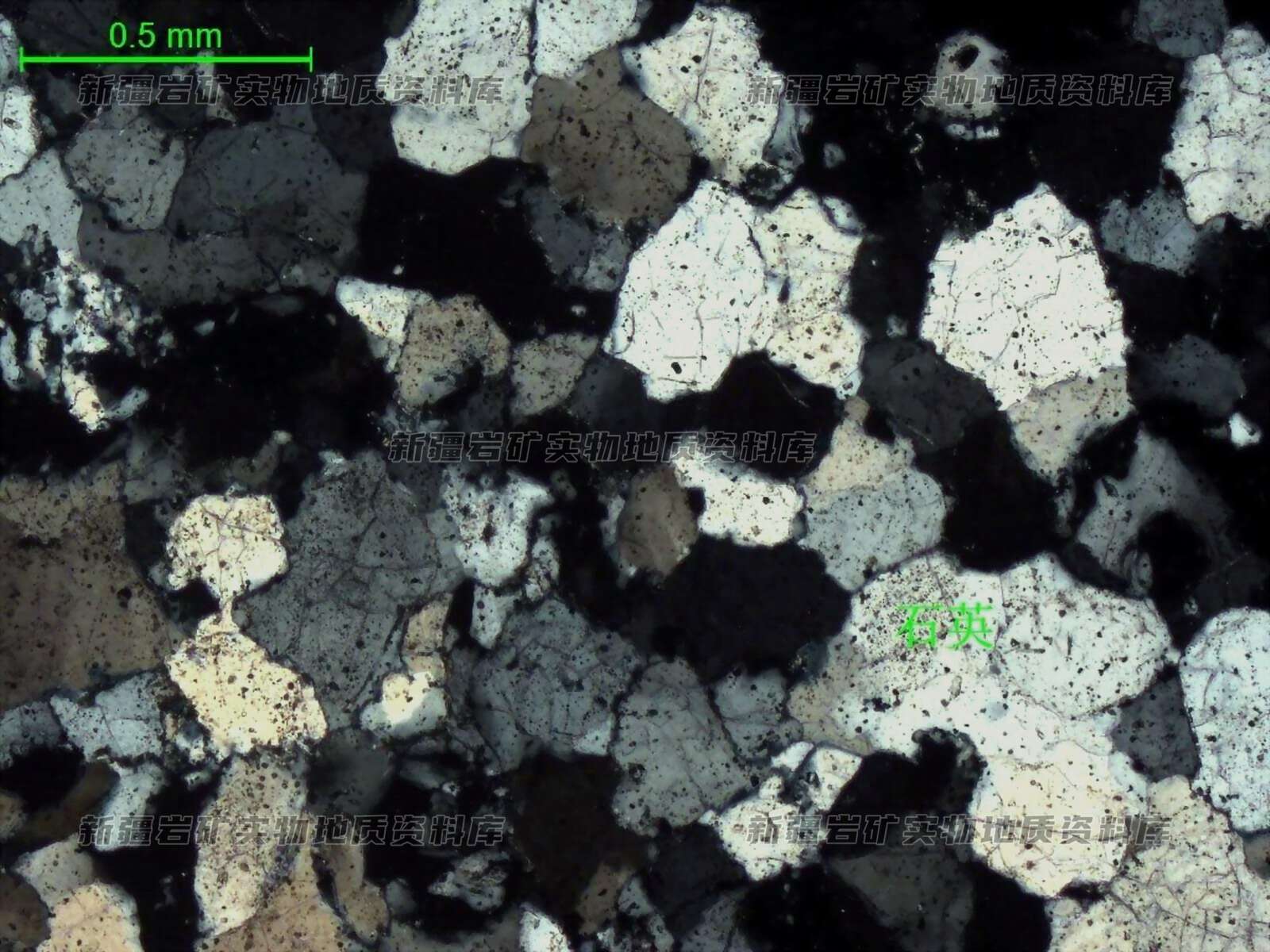 岩石具中粒砂状结构,块状构造,主要由石英颗粒组成,见有次生加大,呈次棱角状、次圆状,粒径0.25-0-1mm,多数为多0.25-0.5mm,紧密堆积,多发育裂隙,粒间胶结物也是石英。