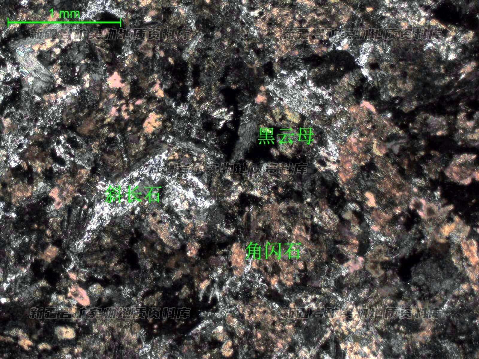 岩石特征描述: 岩石蚀变极强,矿物主要为斜长石、角闪石,黑云母等,粒径约0.2-0.6mm,相互混杂在一起,边界不甚清晰,呈片状、鳞片状,原岩疑似辉长岩,具角闪石化、黑云母化、阳起石化、绢云母化、黝帘石化、碳酸盐化,分布极少金红石。斜长石他形板状、柱状,边界不清晰,与其他矿物紧密堆积,含量约40%;角闪石他形片状,粒状,多次闪石化蚀变,含量约38%;黑云母他形片状、鳞片状,较破碎,含量约20%。